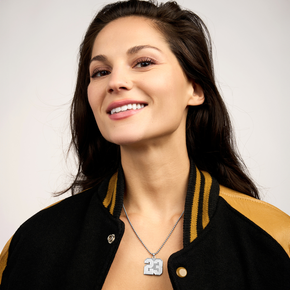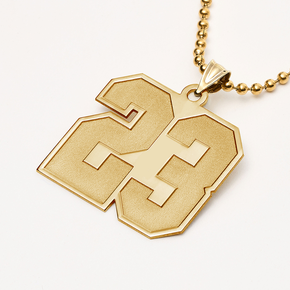 Your custom sports pendant is available in 3 sizes and in 14K Solid Yellow Gold, 14K Solid White Gold, Or Sterling Silver. You can have any number from 0-999.