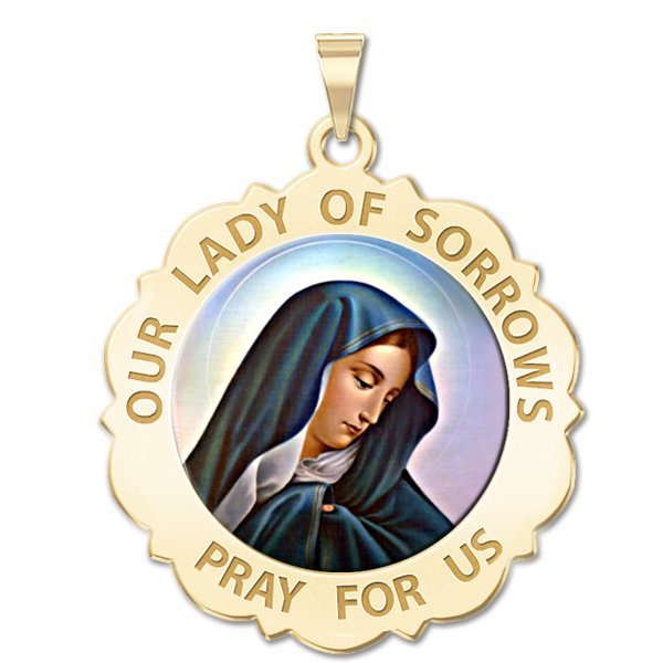 Our Lady of Sorrows s a title of the Blessed Virgin Mary and the name of a feast celebrated on September 15. The Seven Dolours of the Virgin (or Seven Sorrows of the Virgin) is a related devotion in the Catholic Church which has its origins in the New Testament prophecy of Simeon (Luke 2:35).
