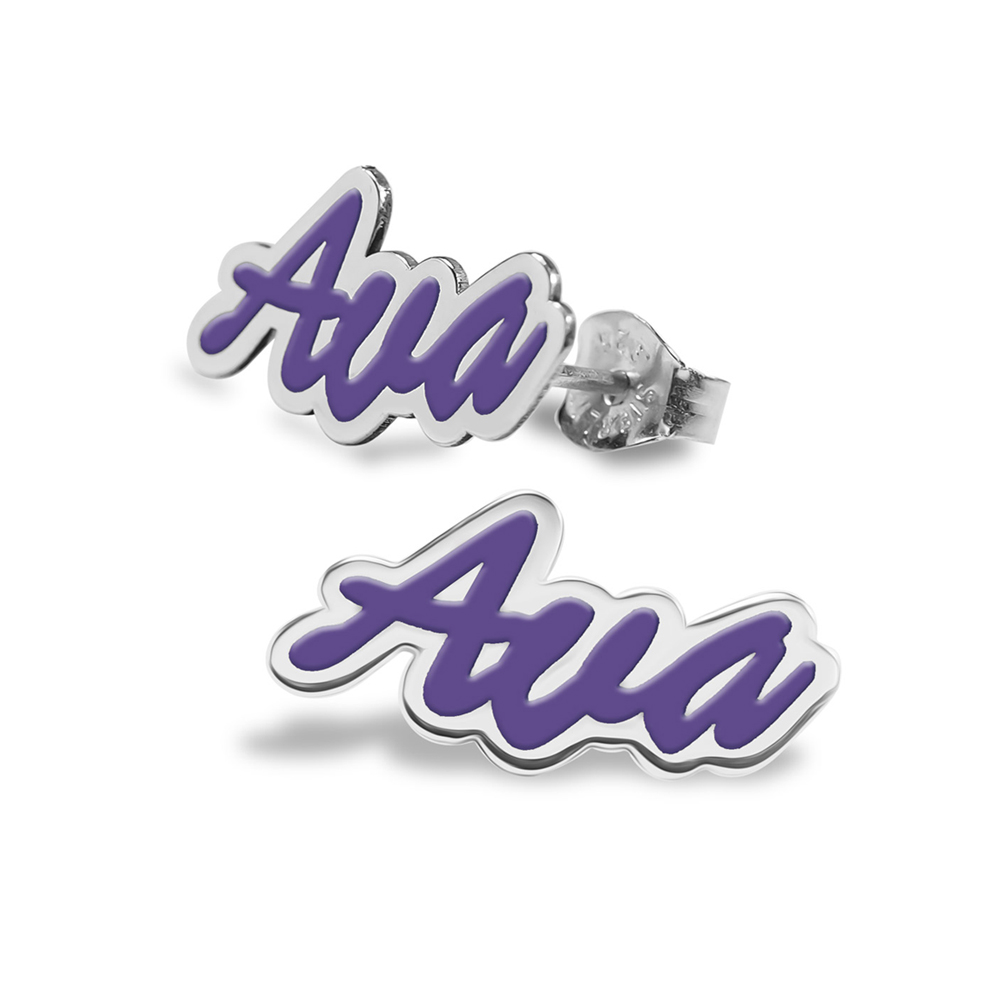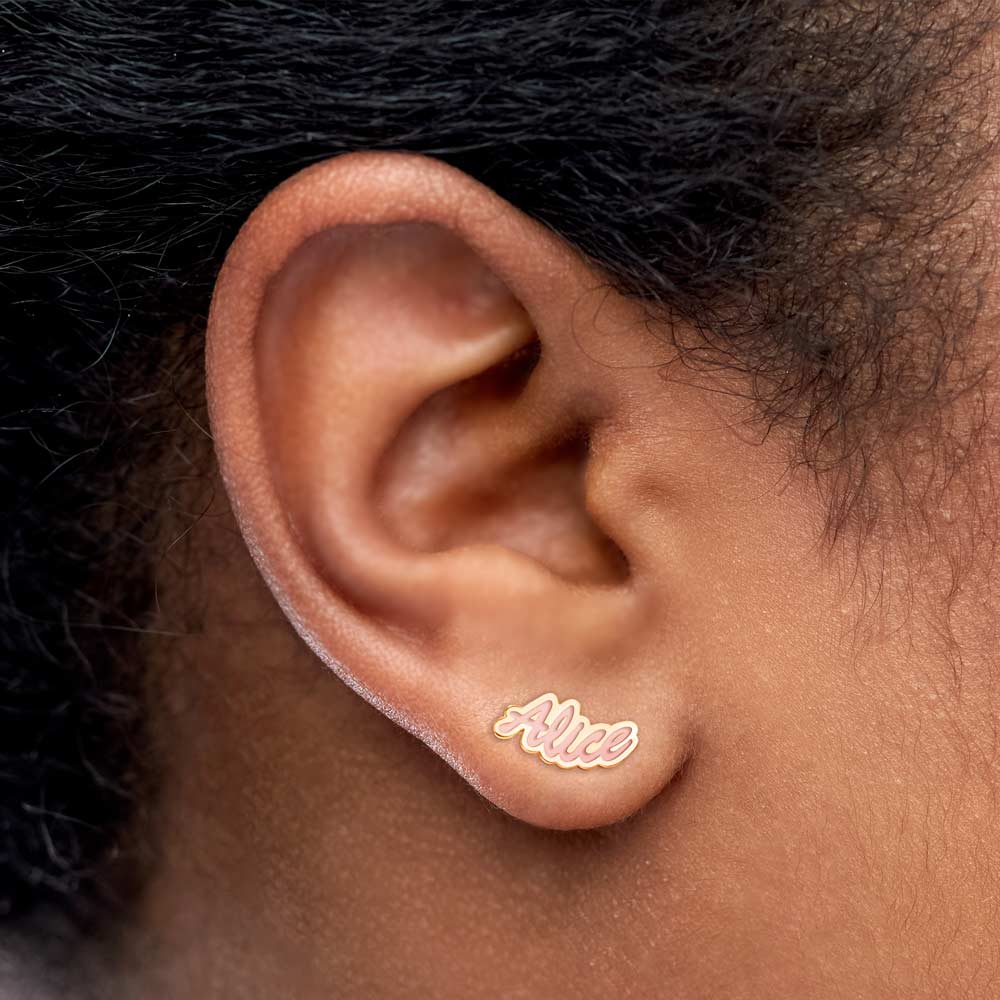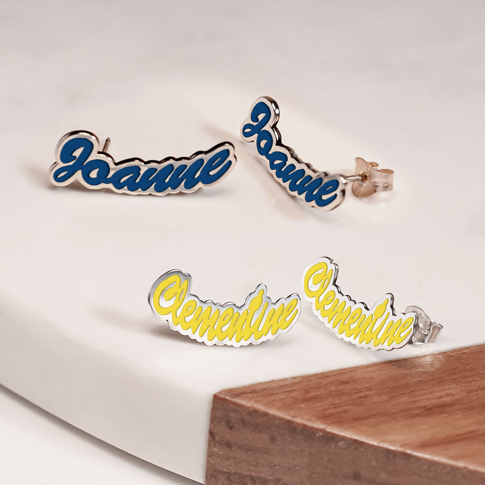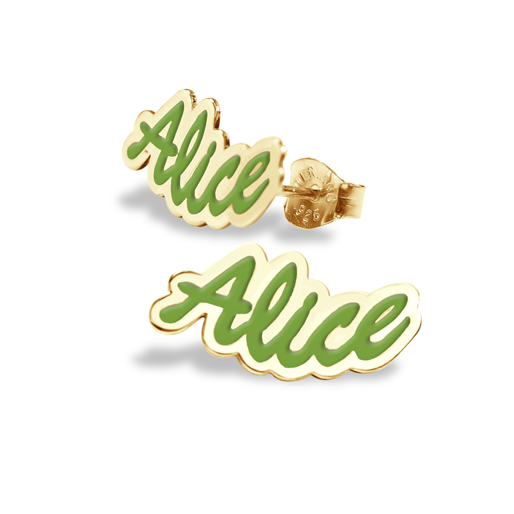 This pair of Color Enamel Script Name Earrings is available in Solid .925 Sterling Silver, Gold Plated, Rose Gold