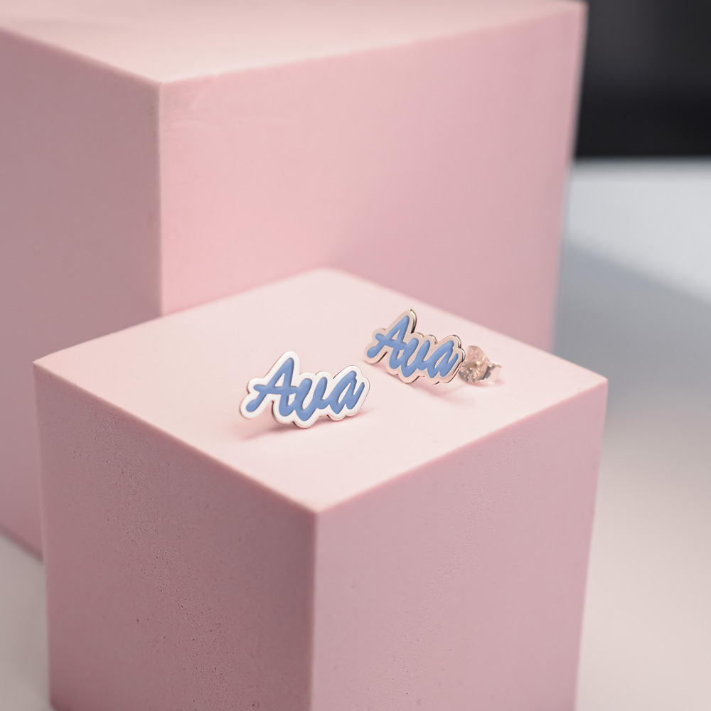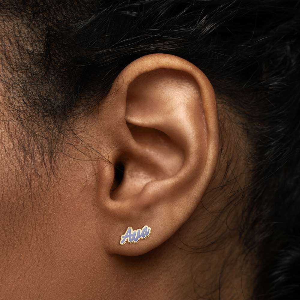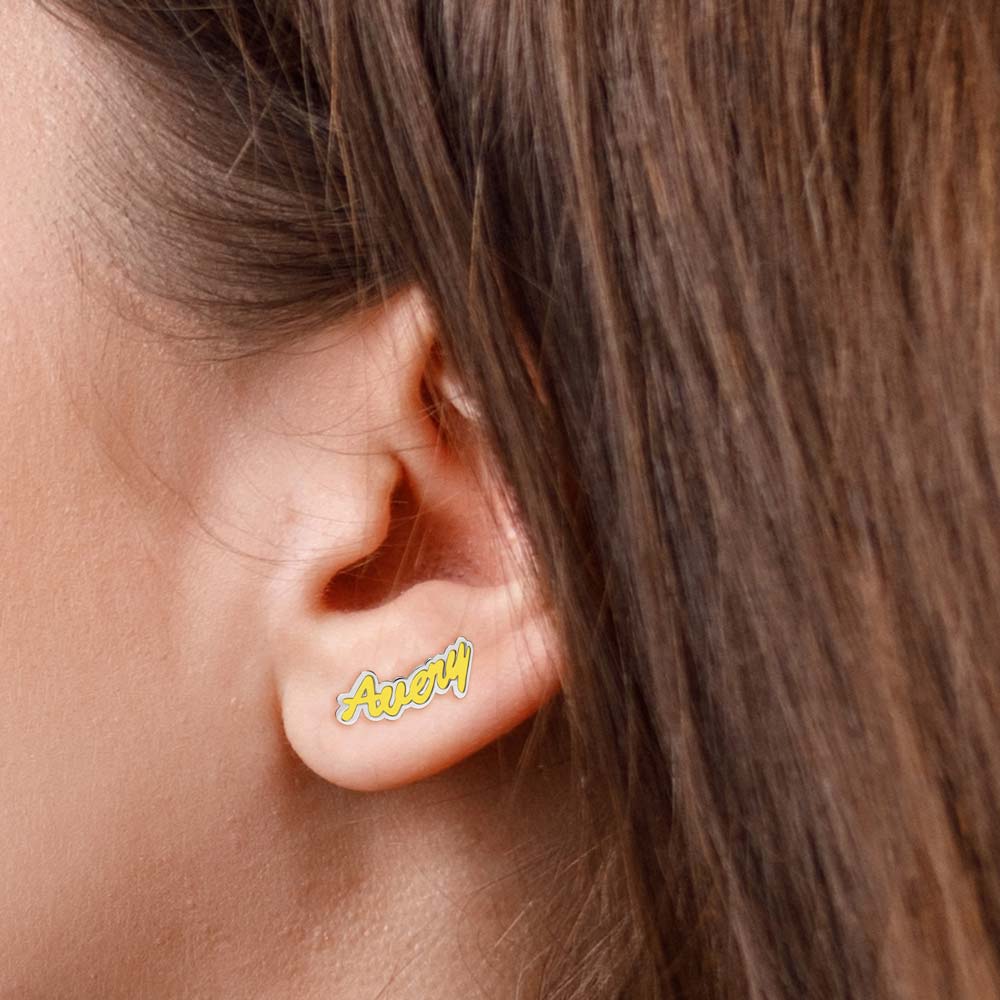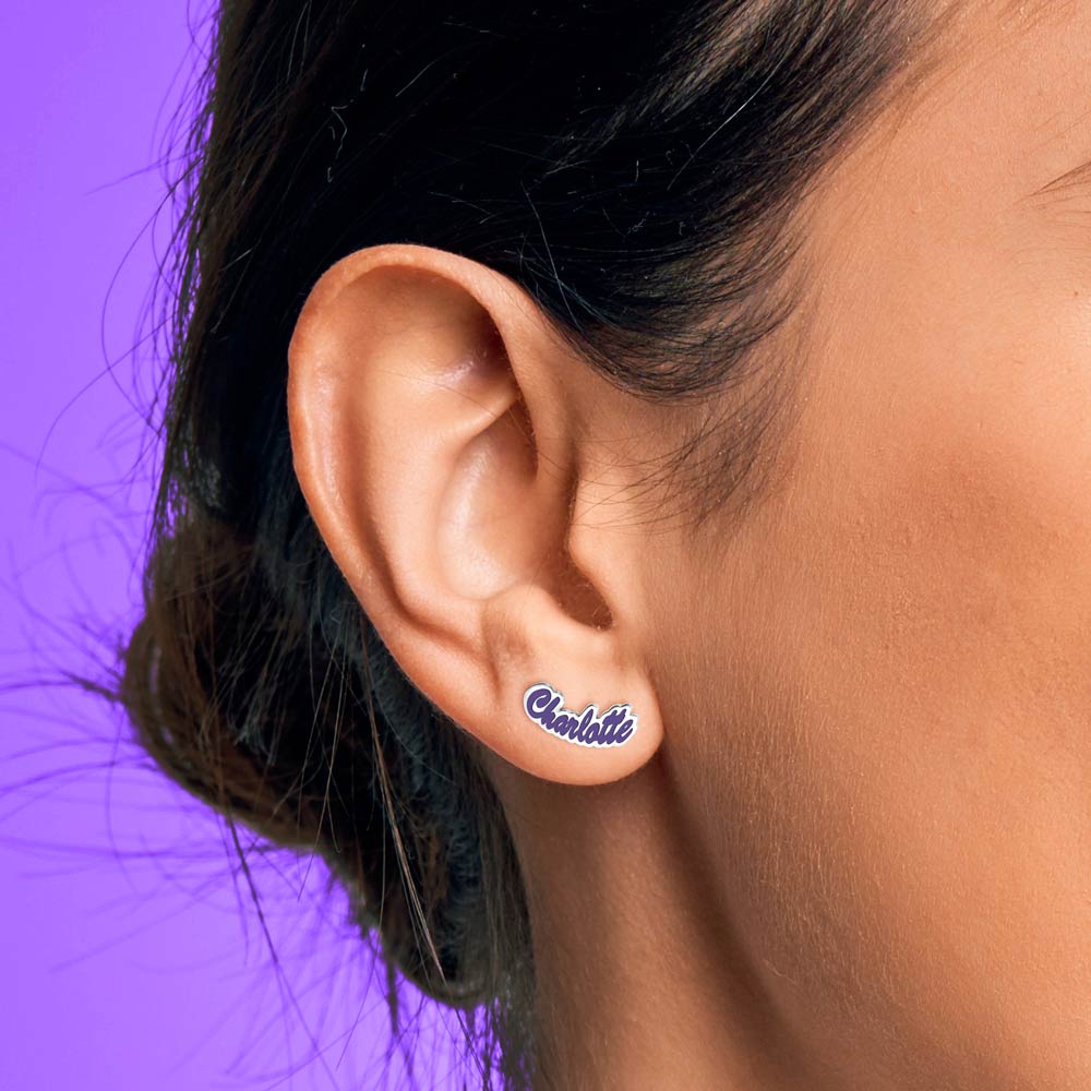 This pair of Color Enamel Script Name Earrings is available in Solid .925 Sterling Silver, Gold Plated, Rose Gold