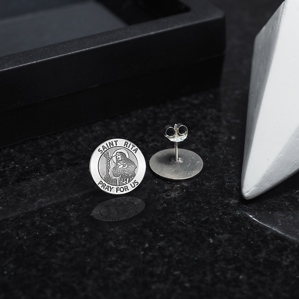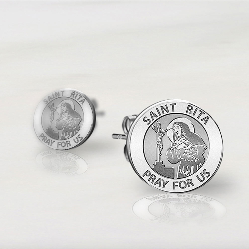 This pair of high polished saint earrings is available in Solid .925 Sterling Silver, Gold Plated, or Solid 14k Gold