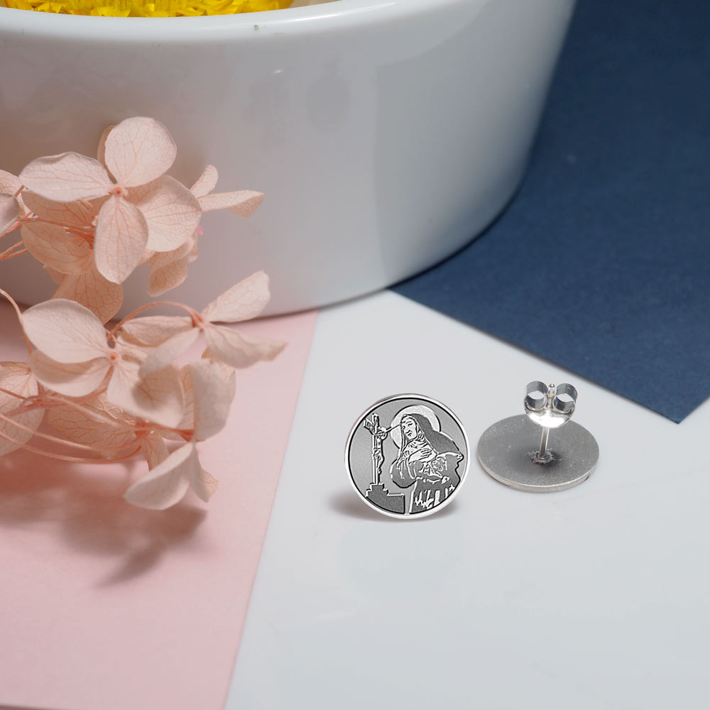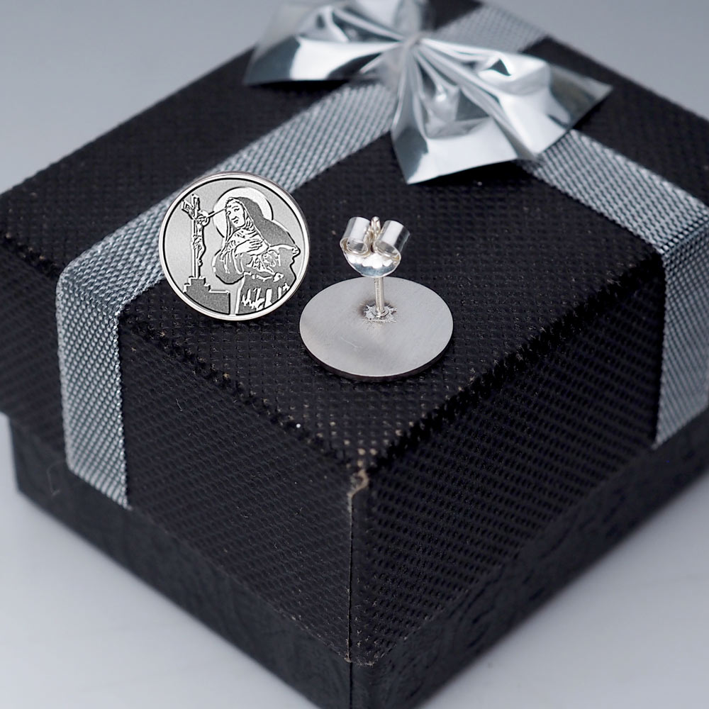 This pair of high polished saint earrings is available in Solid .925 Sterling Silver, Gold Plated, or Solid 14k Gold