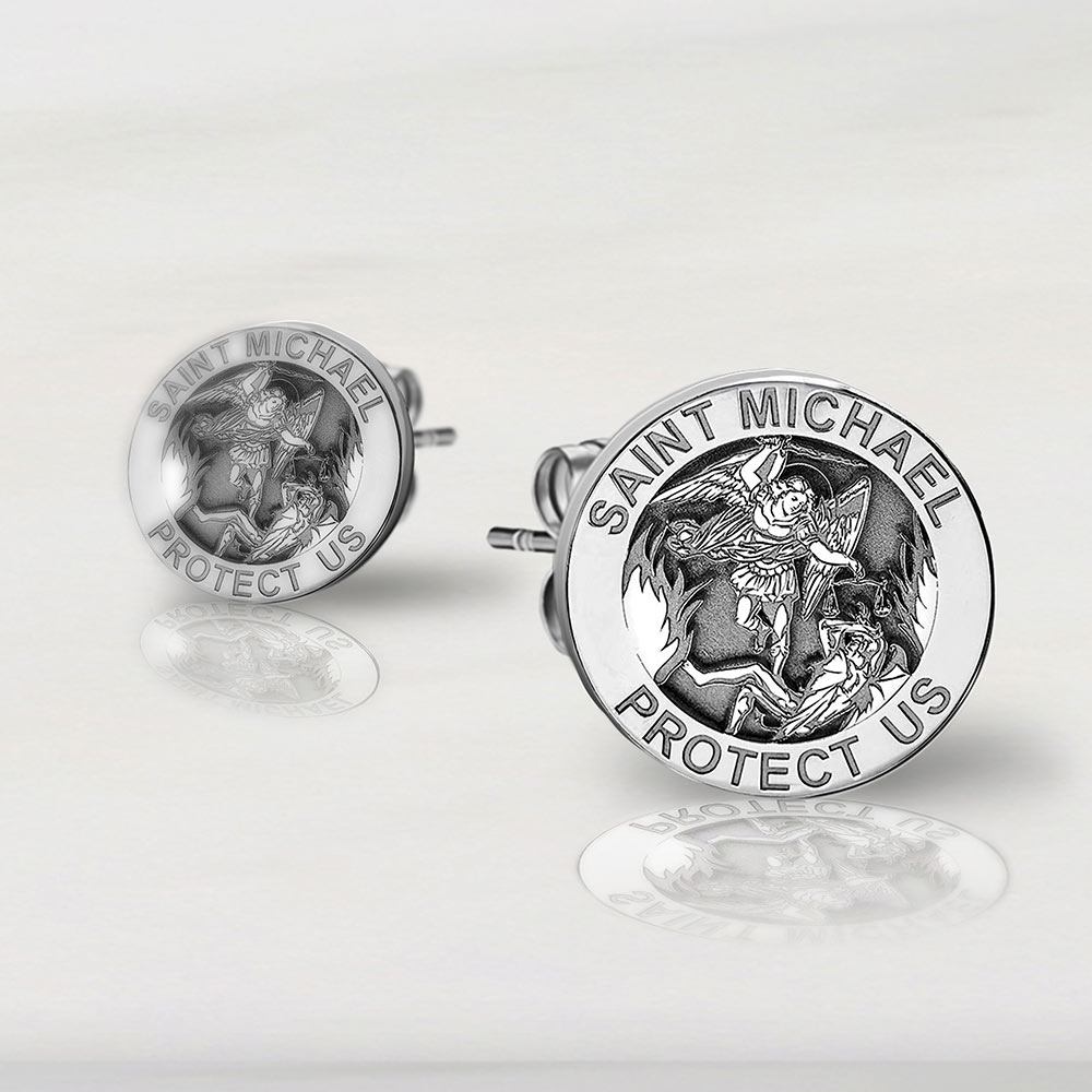 This pair of high polished saint earrings is available in Solid .925 Sterling Silver, Gold Plated, or Solid 14k Gold