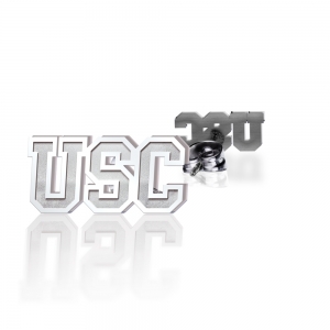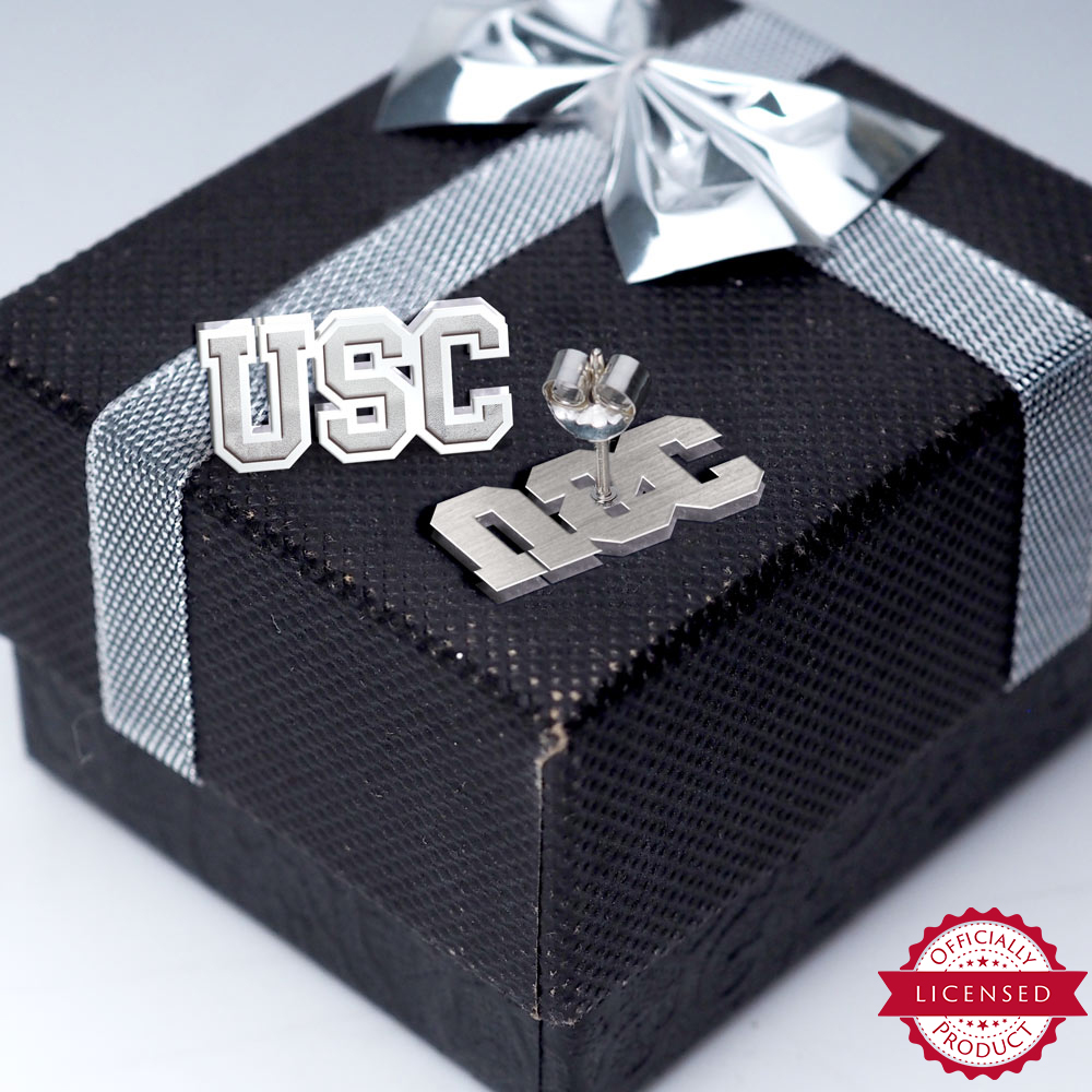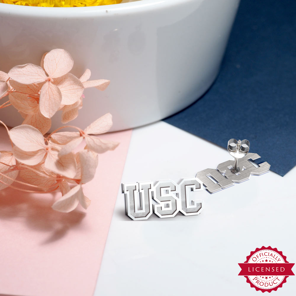 This pair of University of Southern California earrings is available in Stainless Steel, Solid .925 Sterling Silver, Black Sterling Silver, Gold Plated, Rose Gold Plated or Solid 14k Gold. Each earring measures 18mm in width which is 3/4 inches wide. They are made to fit perfectly on a female or child's ear.