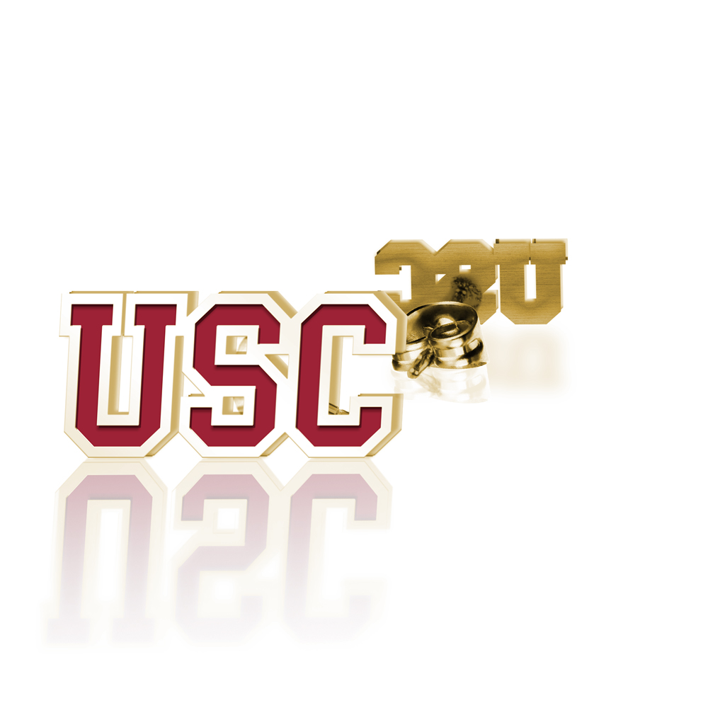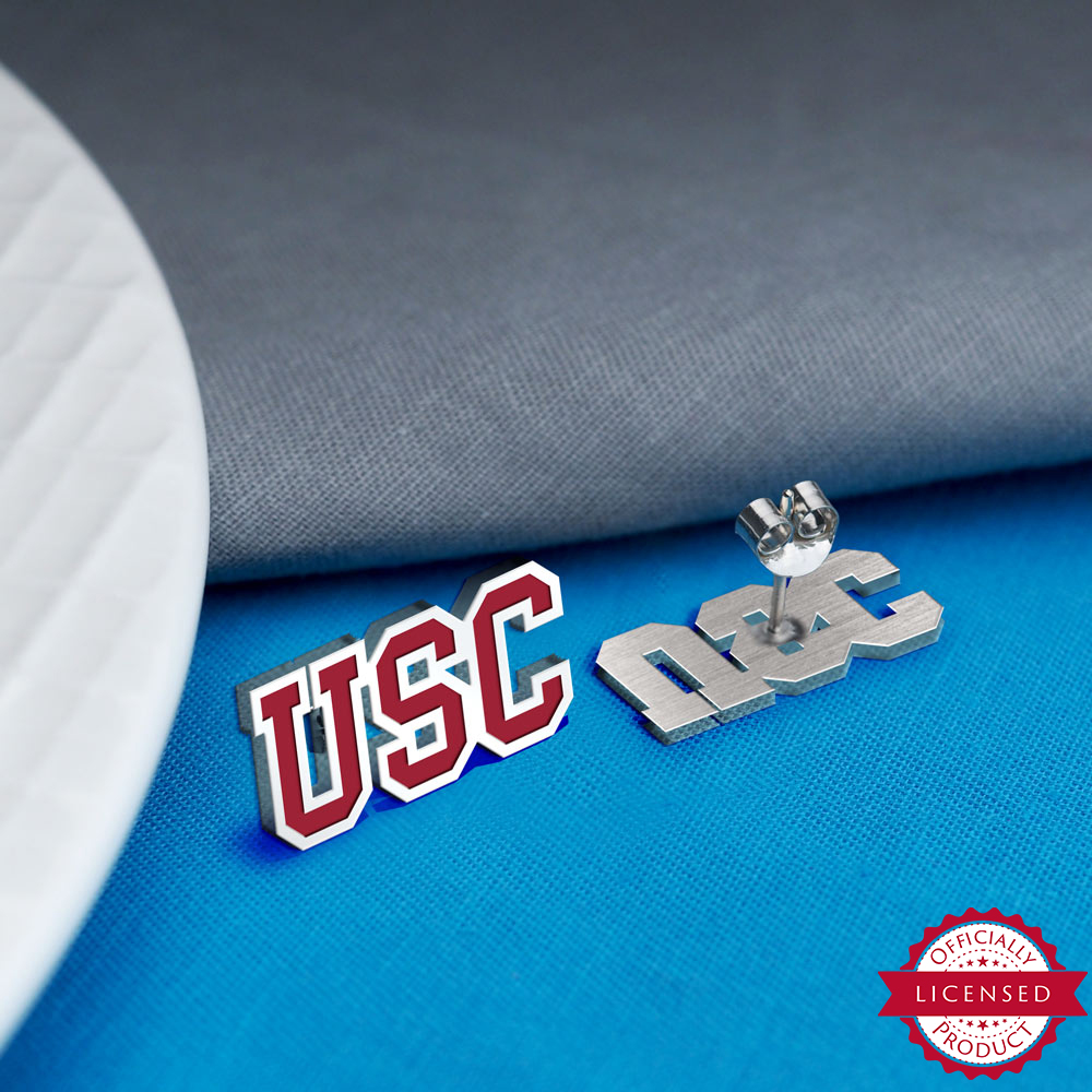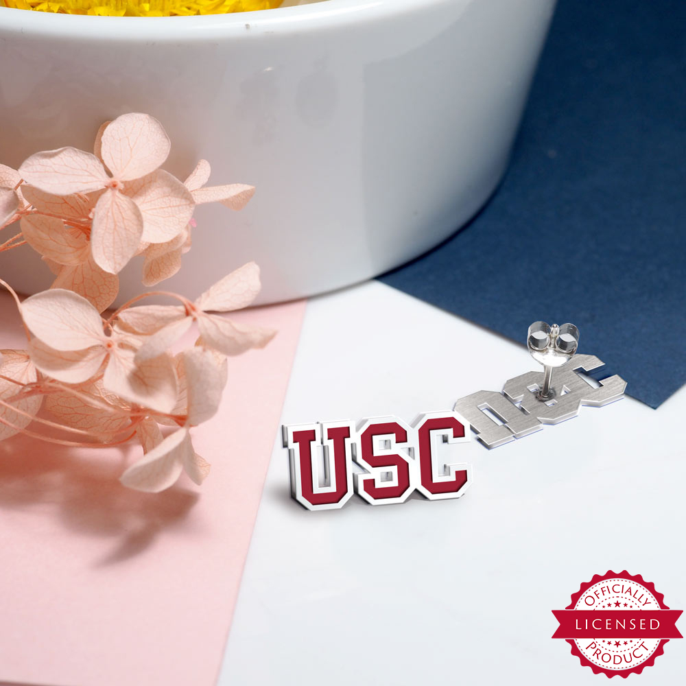 This pair of University of Southern California earrings is available in Stainless Steel, Solid .925 Sterling Silver, Black Sterling Silver, Gold Plated, Rose Gold Plated or Solid 14k Gold. Each earring measures 18mm in width which is 3/4 inches wide. They are made to fit perfectly on a female or child's ear.