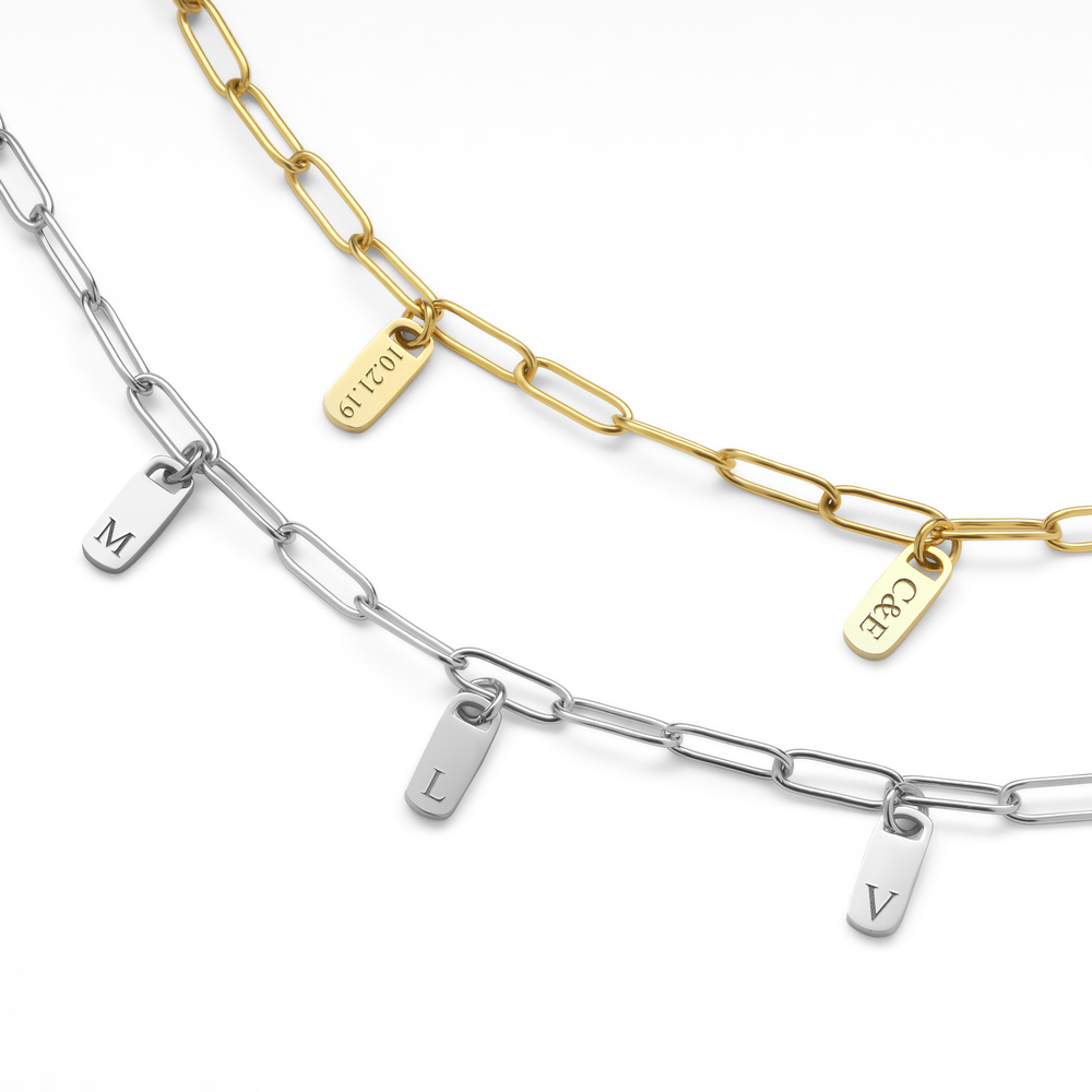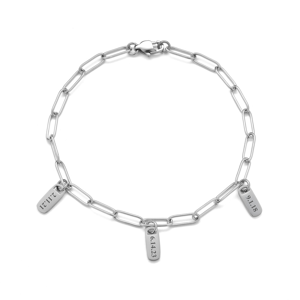 elongated links and multiple customizable tag charms, this bracelet is the perfect blend of modern minimalism and