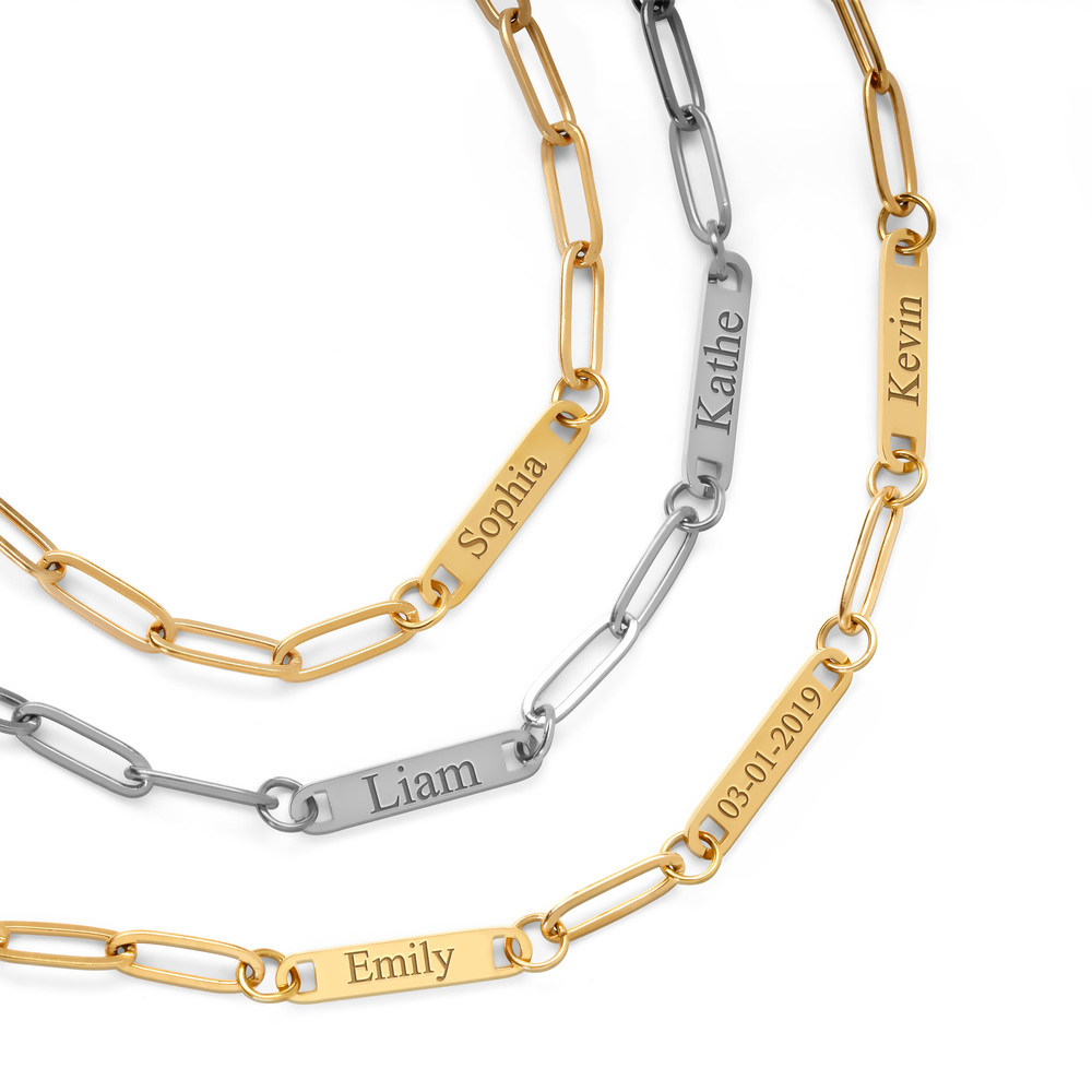 Showcase your style with this trendy paperclip-inspired name bracelet, available in gold-plated or sterling silver 925. The sleek bar pendant can be customized with any name, word, or special date (up to 12 characters), making it the perfect everyday keepsake.