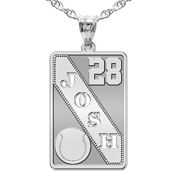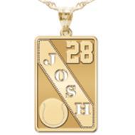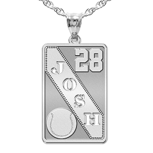 Your custom sports pendant is available in 2 sizes and in 14K Solid Yellow Gold, 14K Solid White Gold, Or Sterling Silver. Most can handle a name, team name, and even the number the players wear.