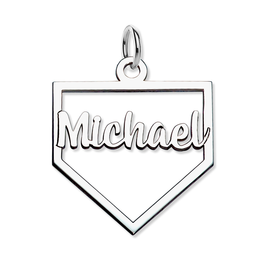 Your Personalized Cut-out Baseball Homeplate Pendant w/ Name is available in 3/4 x 3/4 sizes and in Sterling Silver or Gold Plated.