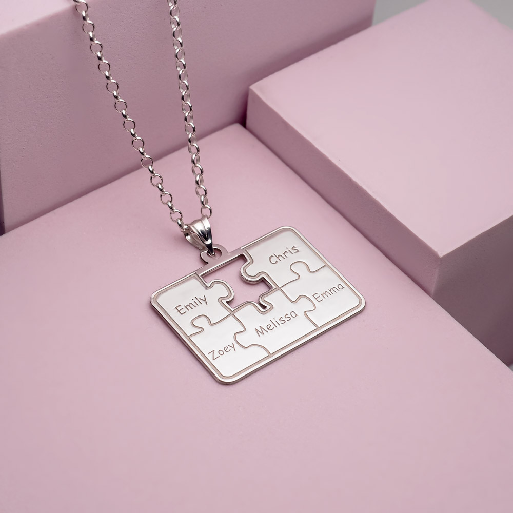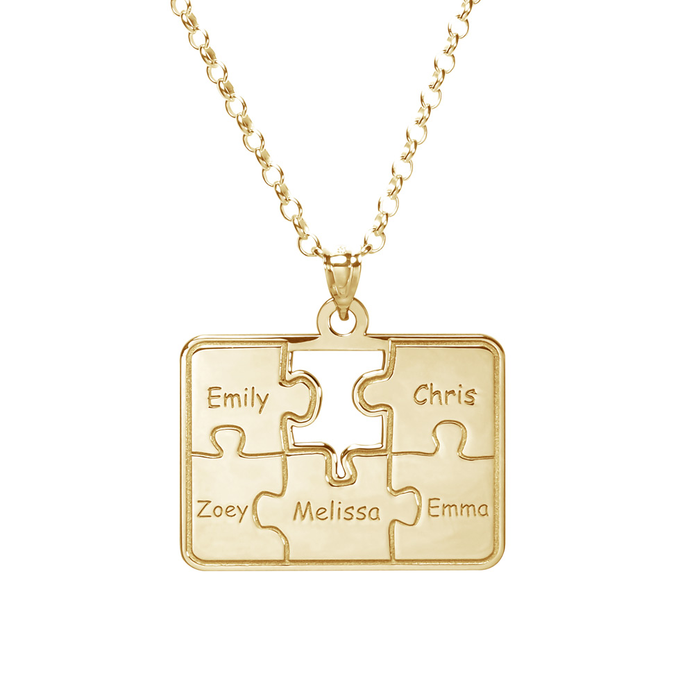 This Personalized Family Five Piece Jigsaw Puzzle Pendant includes an 18 Inch Chain. The perfect gift for Mom, Grandma, Sister, Aunt even Best Friend. This Pendant symbolizes how a family always comes together like a puzzle.