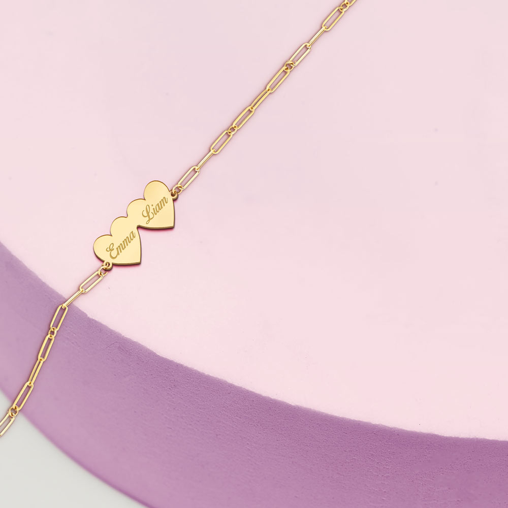 name hearts on a delicate paperclip chain, this bracelet is a stunning keepsake that will remind her of all the love in