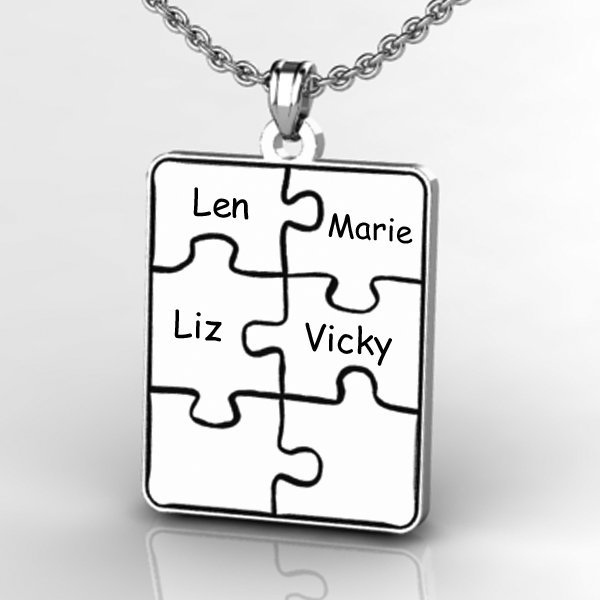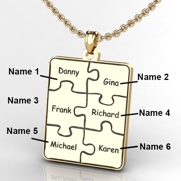 This Personalized Family Six Piece Jigsaw Puzzle Pendant includes an 18 Inch Chain. The perfect gift for Mom, Grandma, Sister, Aunt even Best Friend. This Pendant symbolizes how a family always comes together like a puzzle.