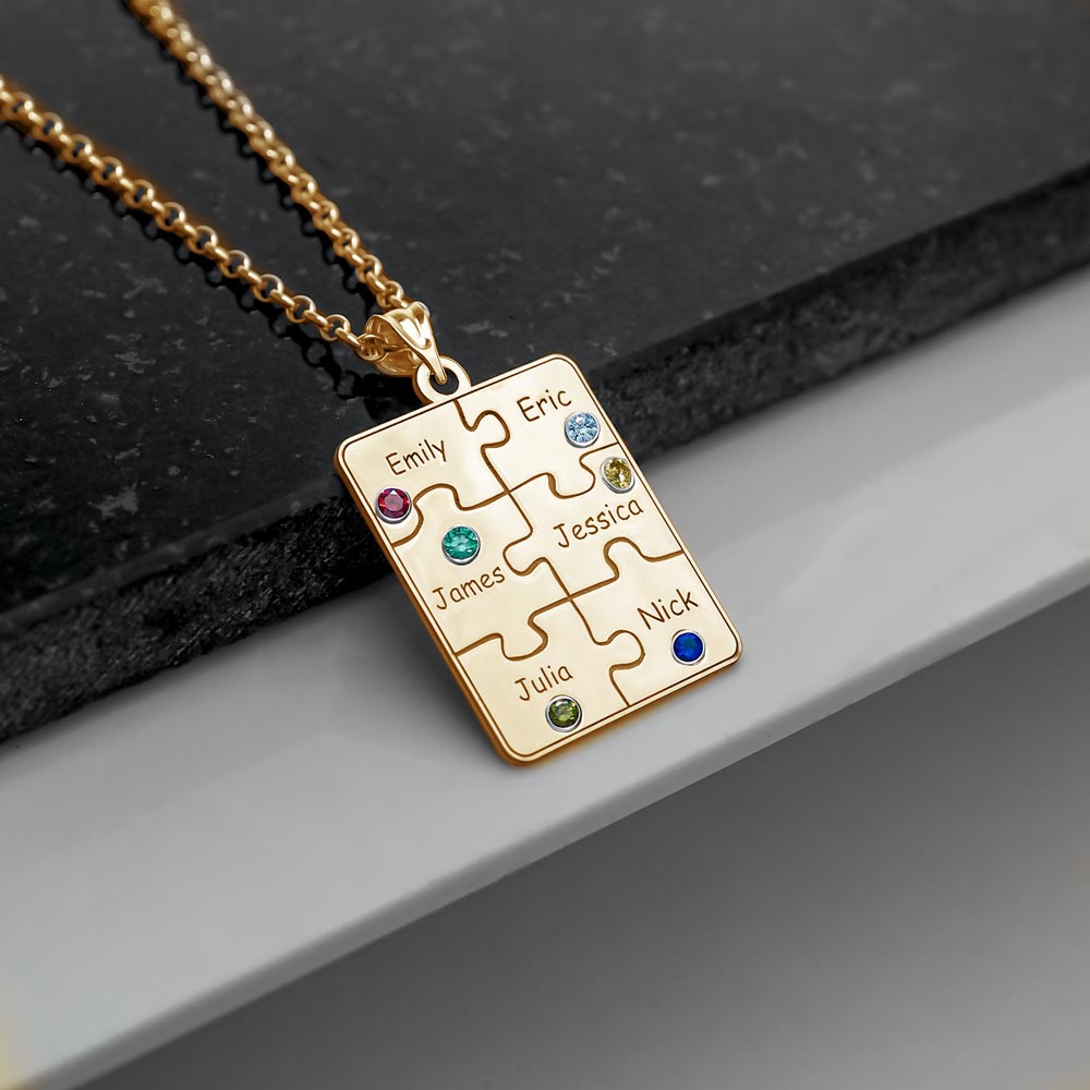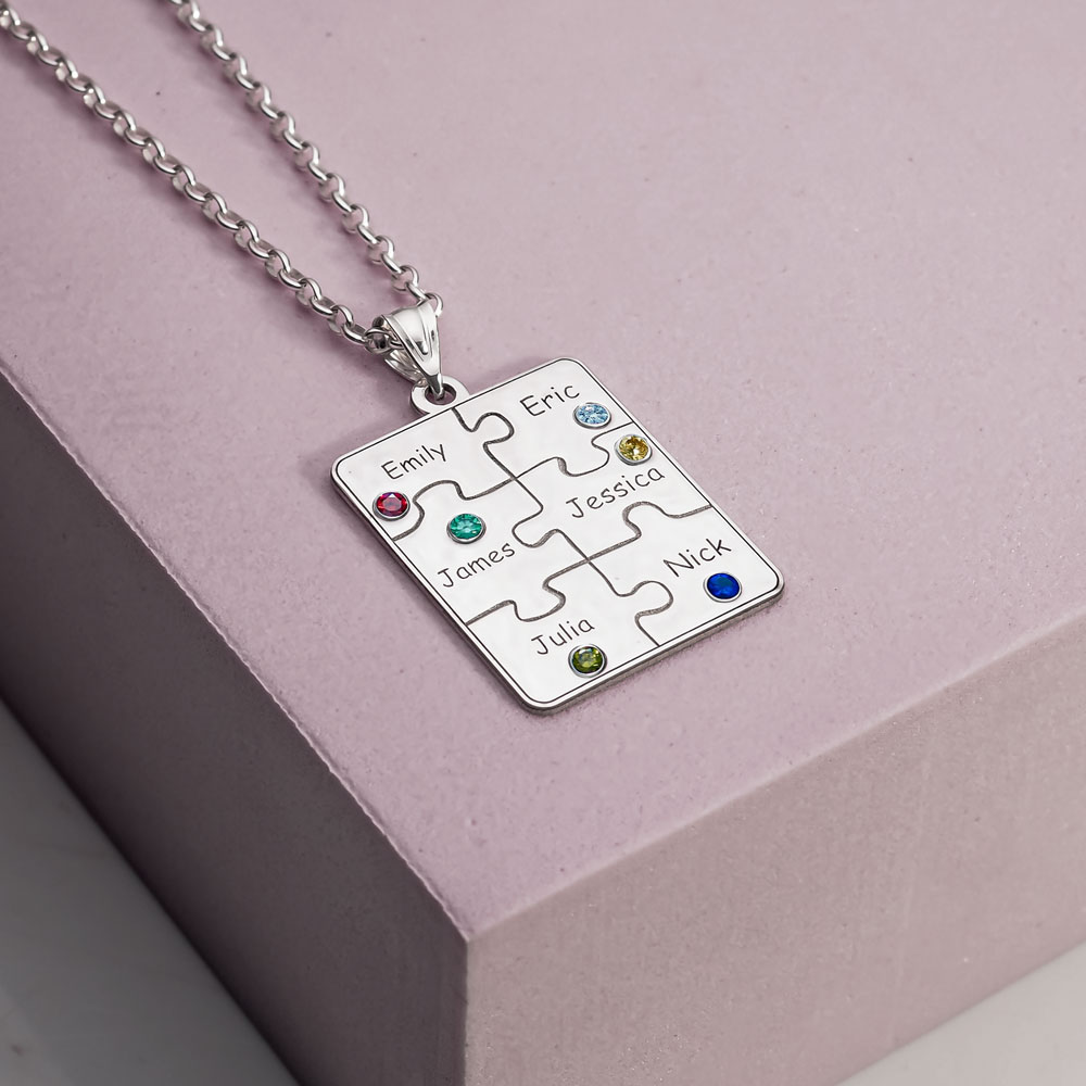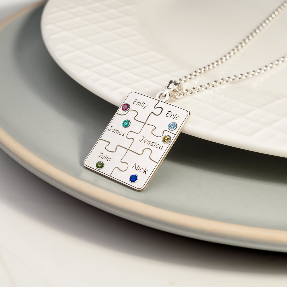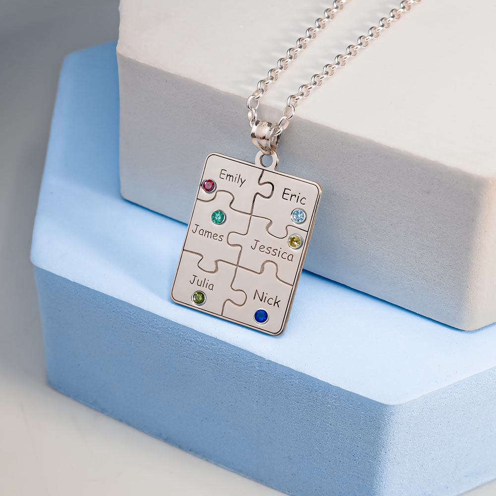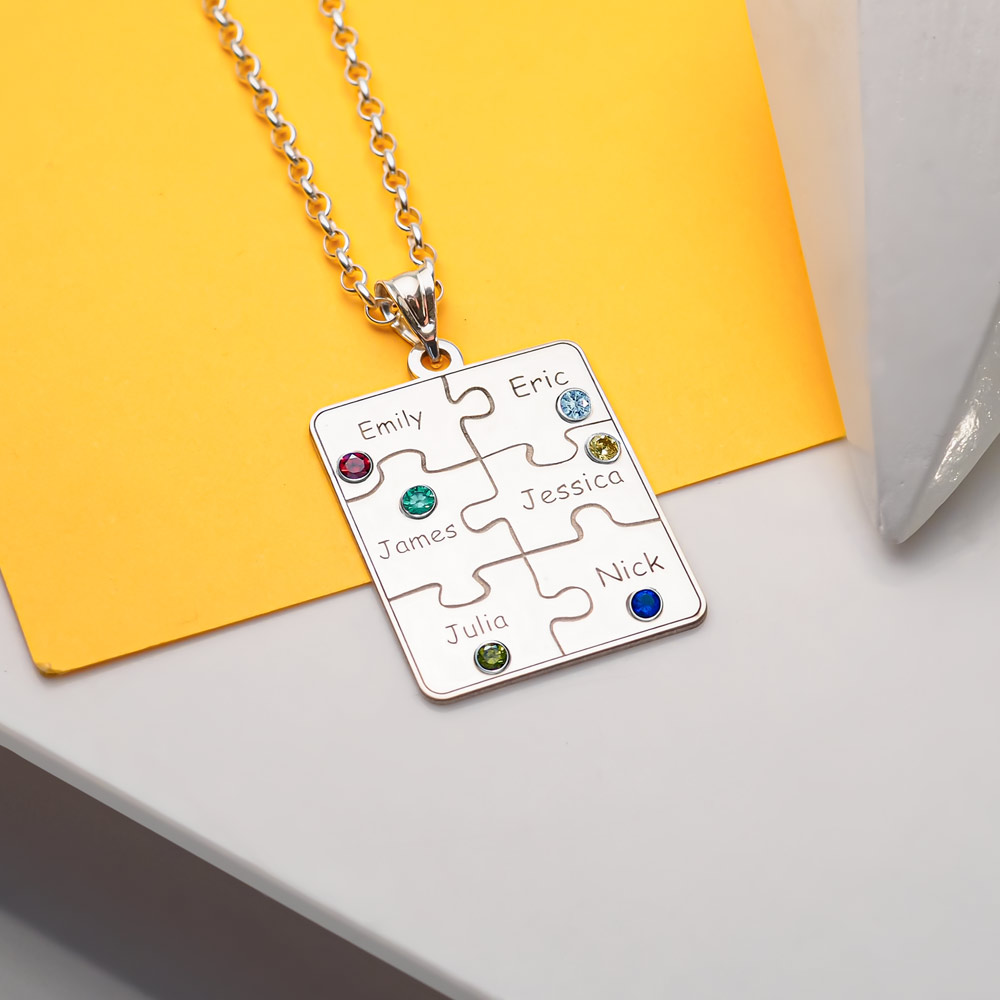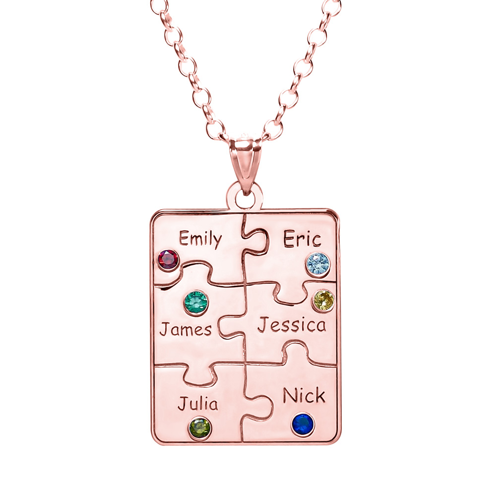This Personalized Family Six Piece Jigsaw Puzzle Pendant includes an 18 Inch Chain. The perfect gift for Mom, Grandma, Sister, Aunt even Best Friend. This Pendant symbolizes how a family always comes together like a puzzle.