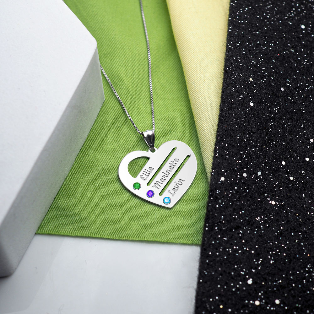 Personalized Heart Family Pendant with 3 Birthstones & Names Includes 18 Inch Chain