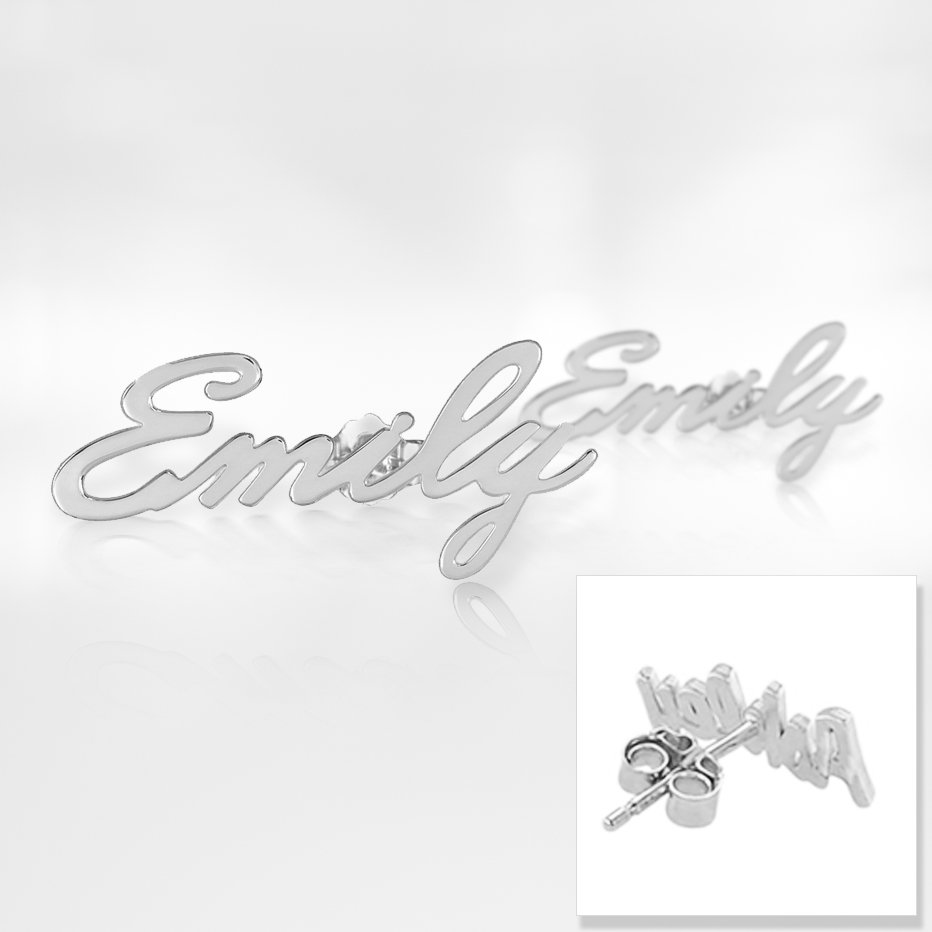 This horizontal high polished script name stud earring is available in Solid .925 Sterling Silver, 14k Solid Gold or Gold Plated.