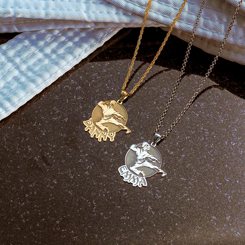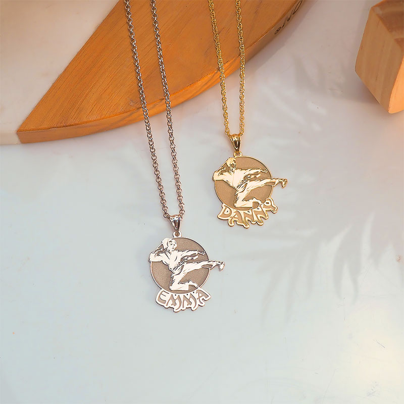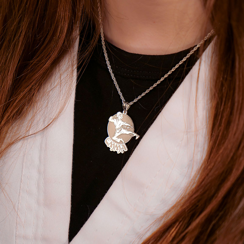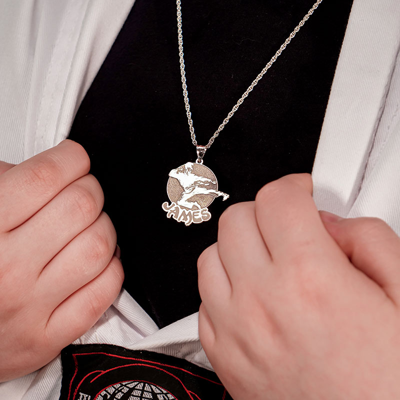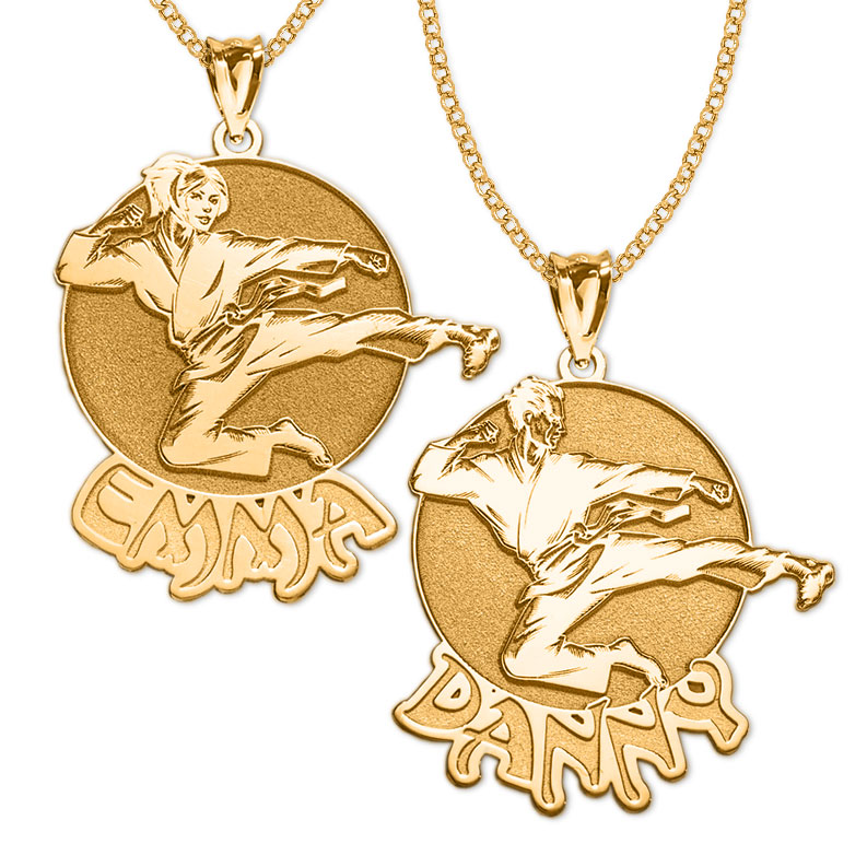 Your custom Martial Arts pendant is available in 3 sizes and in 14K Solid Yellow Gold, 14K Solid White Gold, Or Sterling Silver