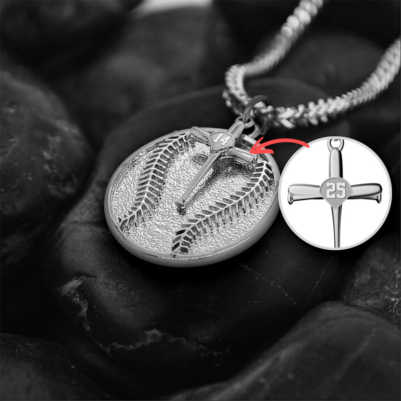 Wear your players number proud with this new personalized baseball stitch round necklace with a customized 3D baseball bat cross charm. The baseball diamond cross can be personalized with a players number or just plain by itself.
