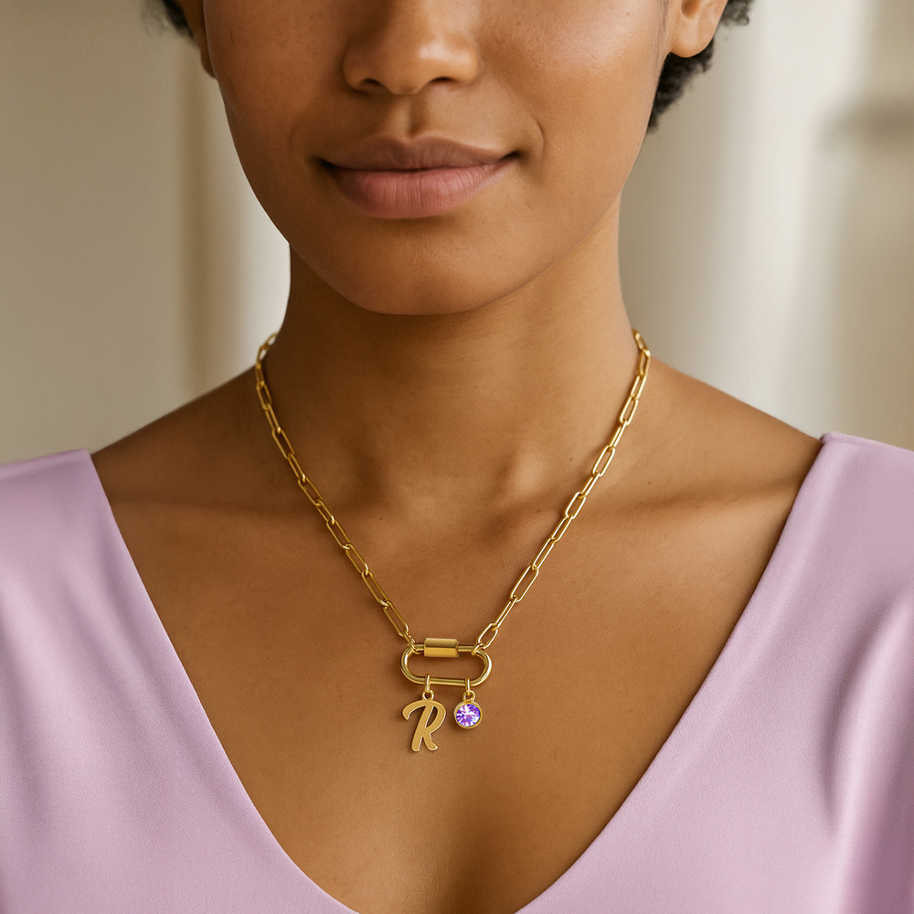 This beautifully crafted piece features your custom initial in elegant script, paired with a sparkling birthstone charm of your choice. The modern paperclip chain and charm holder create a stylish look that's perfect for layering or wearing on its own. Whether it's a thoughtful gift or a piece made just for you, this necklace captures the beauty of personalization and the meaning behind every initial and birthstone.