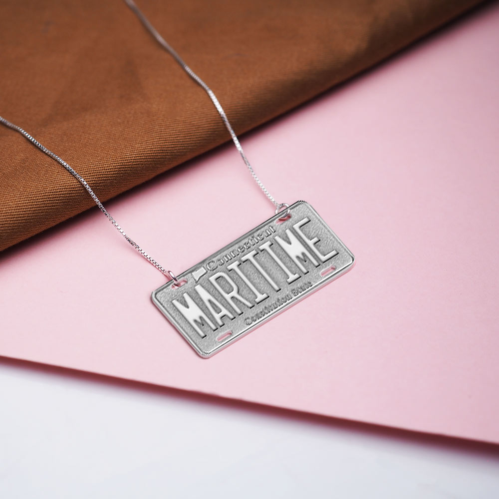 Make a statement with our Personalized Vanity License Plate Pendant! This fun and trendy necklace features a custom license plate pendant with your unique word or message. Choose from all states to create a special piece that represents where you're from or where you've been. It's a great way to show off your personality and style in a personalized way.