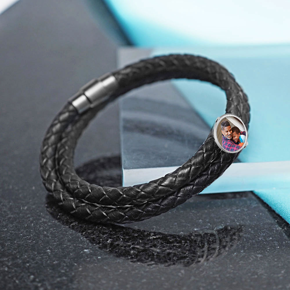 This beautiful bracelet is made of a braided black leather cord held in the centered with a Sterling Silver photo charm which wraps around the layered bracelet. This is the perfect gift for your husband, dad, brother, nephew, even best friend for any occasion, like Father's Day, Christmas, Birthday.