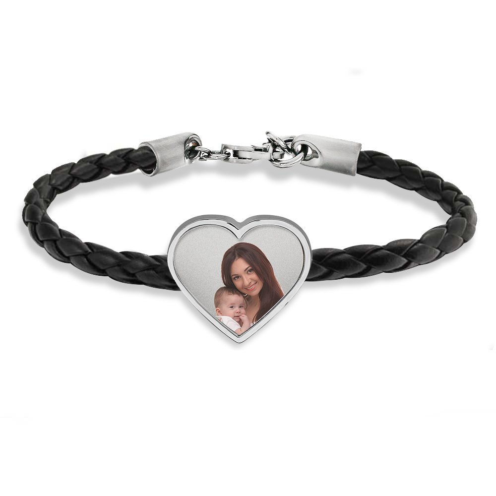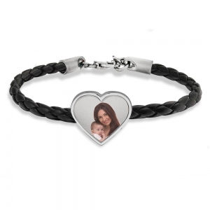 Photo Engraved Leather Rope Bracelet w/ Stainless Steel Heart Charm