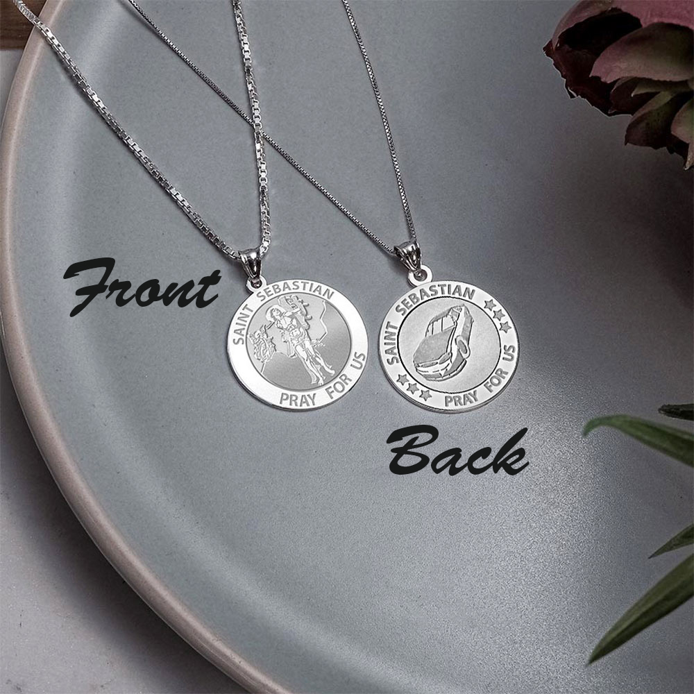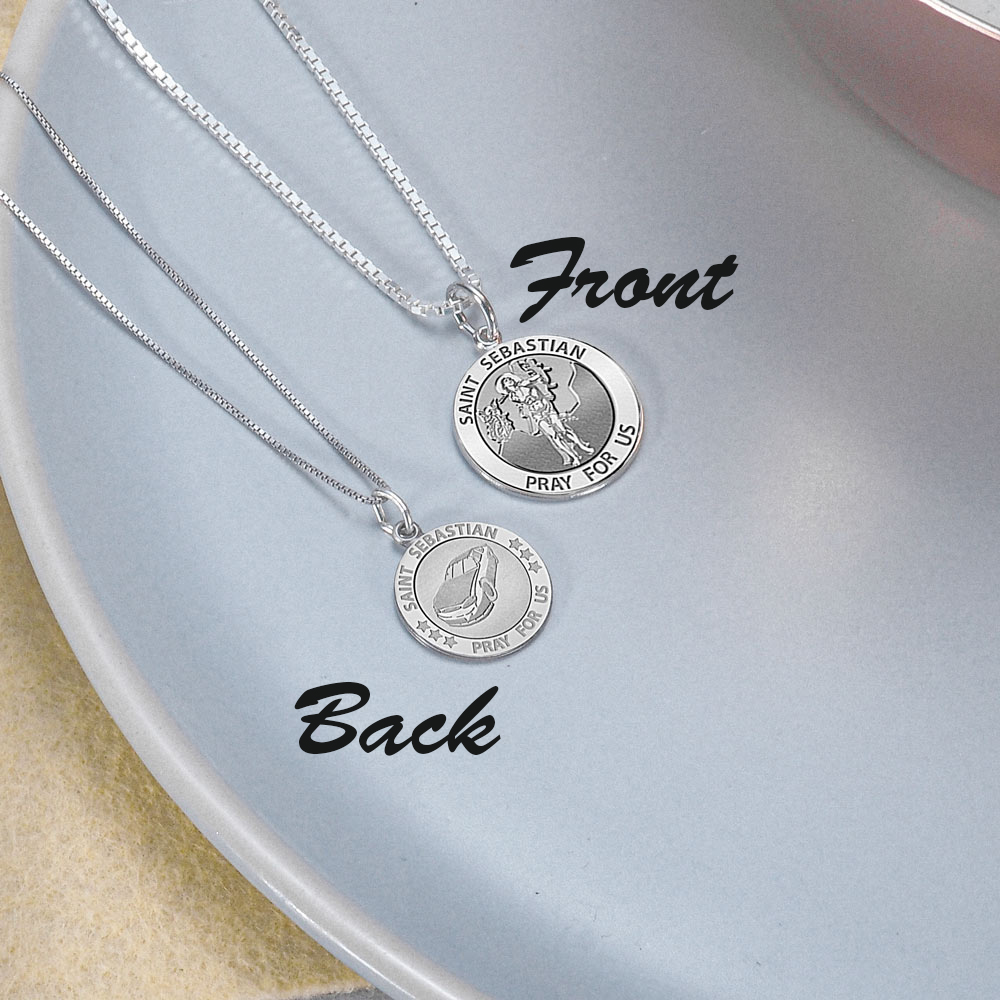 Saint Sebastian was a Christian saint and martyr, who is said to have been killed while the Roman emperor Diocletian engaged in the persecution of Christians in the 3rd century. He is commonly depicted in art and literature tied to a post and shot with arrows just like on this medal. He is patron saint to Soldiers, plagues, arrows, athletes and unofficially youth.