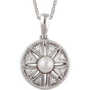 This Pendant comes with a 4 MM Freshwater Round Pearl and has .02 carats of diamonds. This item is approximately 3/4" x 1/2".