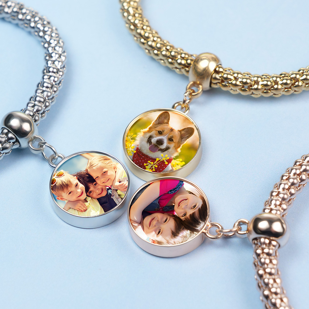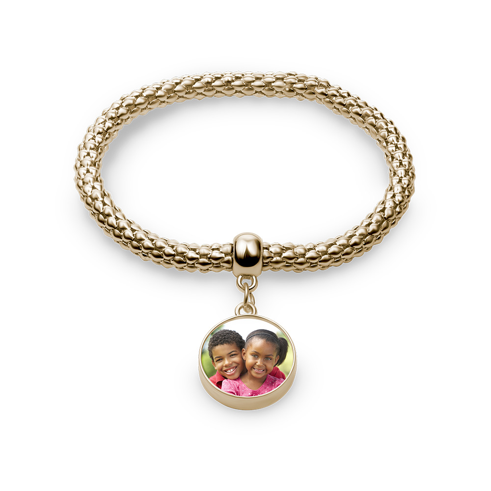 Add a touch of personalized elegance to your ensemble with our Round Photo Charm Stretch Bracelet. This charming accessory features a customizable round photo charm suspended delicately on a comfortable stretch band, allowing you to carry cherished memories wherever you go. Perfect for gifting or treating yourself to a stylish keepsake.