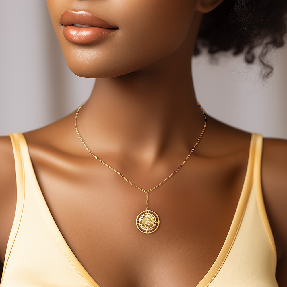 Embrace the beauty of individuality with the Round Saint Pendant with Open Border Paperclip Necklace, a piece that carries a personal story and adds a touch of elegance to your jewelry collection. At the heart of the Necklace is a round pendant featuring an intricate religious design, symbolizing uniqueness and personal connection. The open border around the saint adds a touch of sophistication and highlights the detailed pattern beautifully. Expertly crafted from premium materials, this Necklace promises both durability and a luxurious feel. The metal is meticulously polished to a radiant shine, ensuring a lasting, elegant appearance. This Saint pendant can be personalized, allowing you to immortalize a loved one's faith by adding a deeply personal and sentimental message to the piece. Ideal for both everyday wear and special occasions, this necklace seamlessly transitions from casual to formal settings. Its versatile design makes it a timeless accessory that enhances any outfit. Elegantly packaged in a stylish jewelry box, this necklace makes a heartfelt gift for birthdays, anniversaries, holy sacraments, or any special occasion, celebrating personal connections and cherished memories.