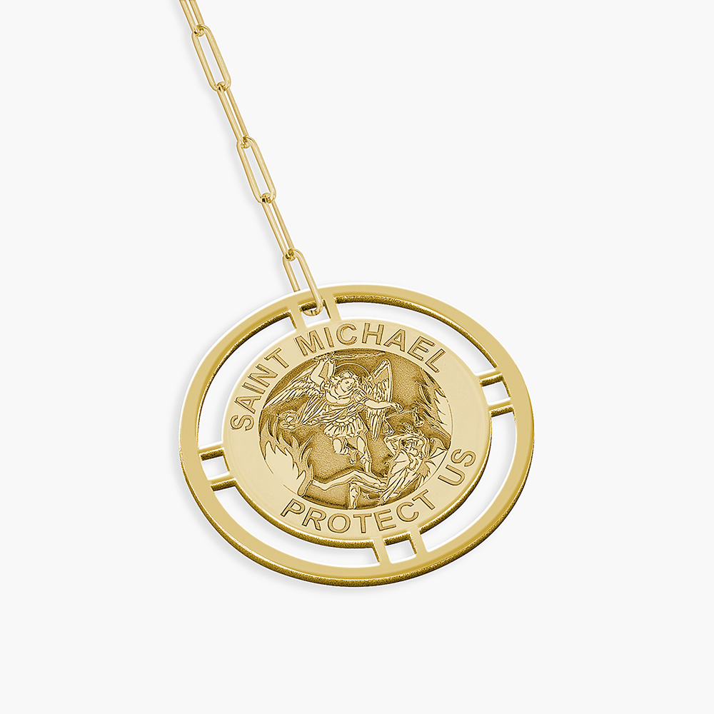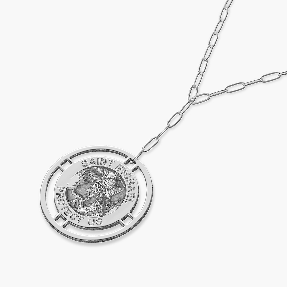 Round Saint Michael Medal with Open Border Necklace With Paper Clip Chain