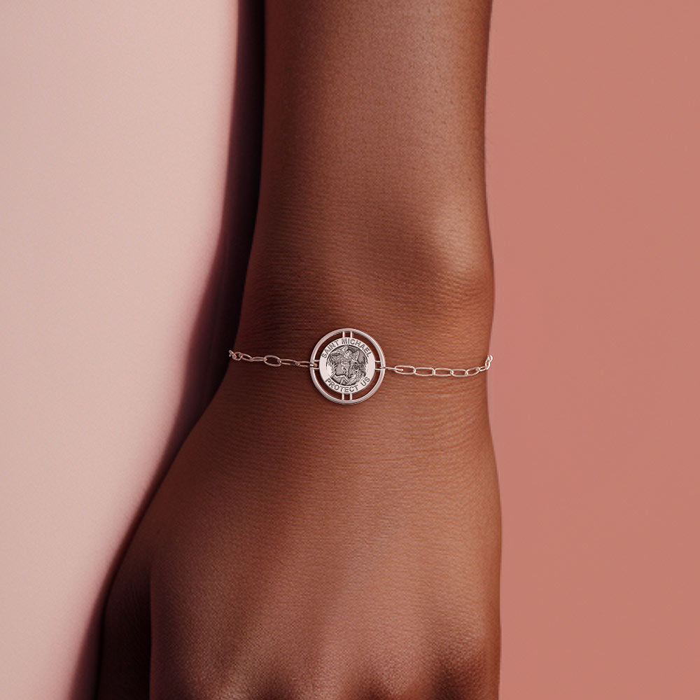 Embrace the beauty of individuality with the Round Saint Pendant with Open Border Paperclip Bracelet, a piece that carries a personal story and adds a touch of elegance to your jewelry collection. At the heart of the bracelet is a round pendant featuring an intricate religious design, symbolizing uniqueness and personal connection. The open border around the saint adds a touch of sophistication and highlights the detailed pattern beautifully. Expertly crafted from premium materials, this bracelet promises both durability and a luxurious feel. The metal is meticulously polished to a radiant shine, ensuring a lasting, elegant appearance. This Saint pendant can be personalized, allowing you to immortalize a loved one's faith by adding a deeply personal and sentimental message to the piece. Ideal for both everyday wear and special occasions, this bracelet seamlessly transitions from casual to formal settings. Its versatile design makes it a timeless accessory that enhances any outfit. Elegantly packaged in a stylish jewelry box, this bracelet makes a heartfelt gift for birthdays, anniversaries, holy sacraments, or any special occasion, celebrating personal connections and cherished memories.