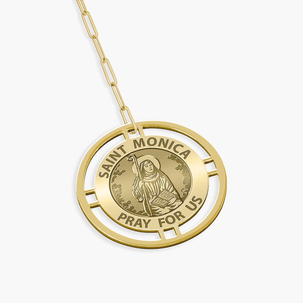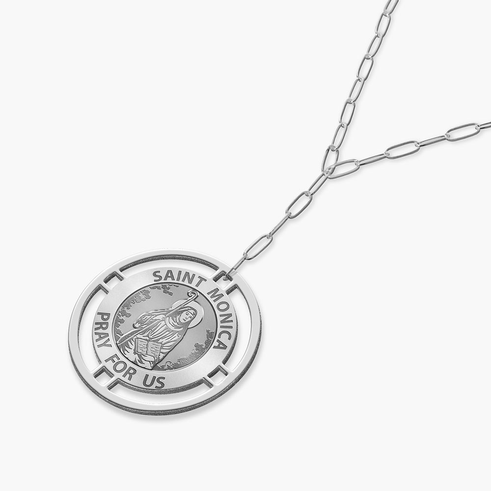 Round Saint Monica Medal with Open Border Necklace and Paper Clip Chain
