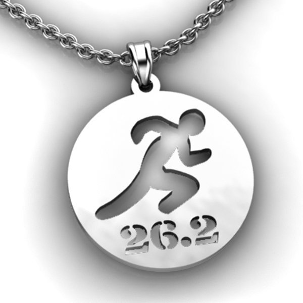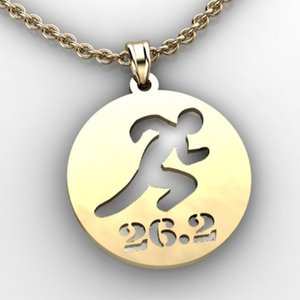 Your custom sports pendant is available in 2 sizes and in 14K Solid Yellow Gold, 14K Solid White Gold, Or Sterling Silver. Have the option of entering your name, marathon miles or even the number the runner wears.