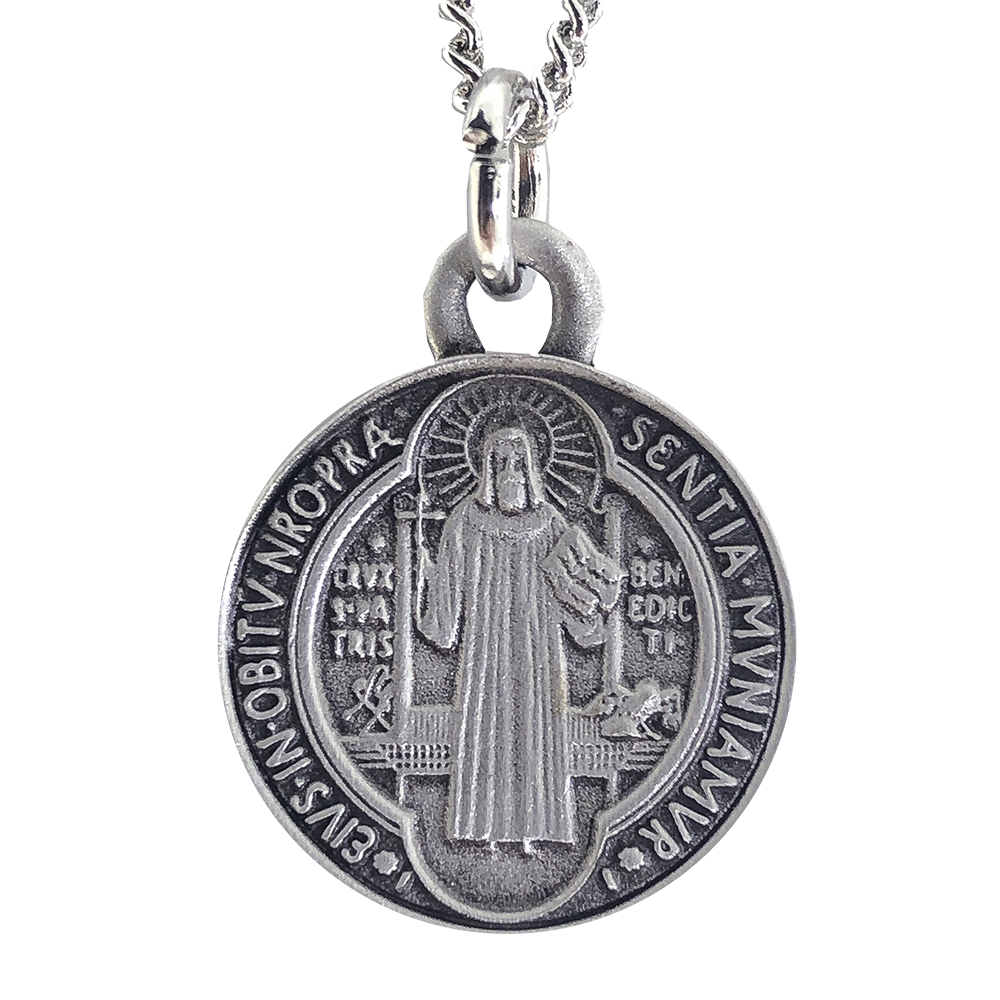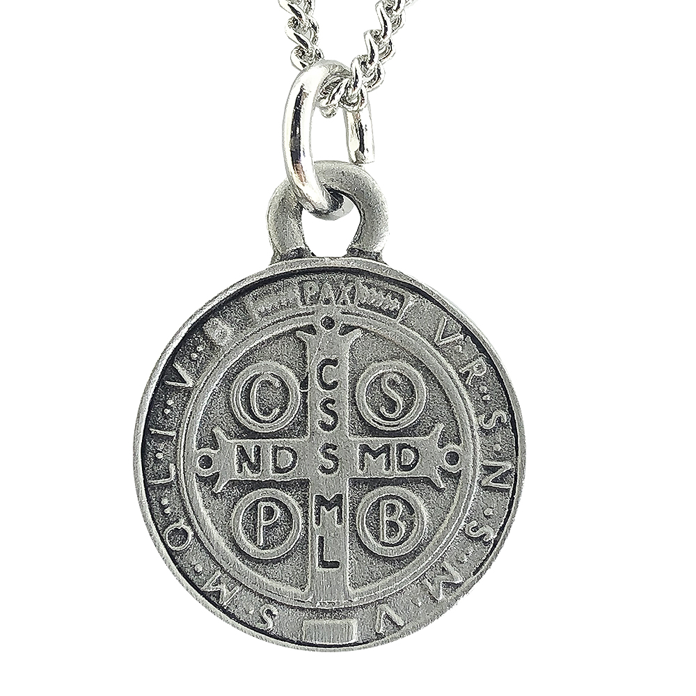 This Saint Benedict Medal measures at 2/3 inch x 2/3 inch, the height of a dime and includes an 18 inch Curb Chain.