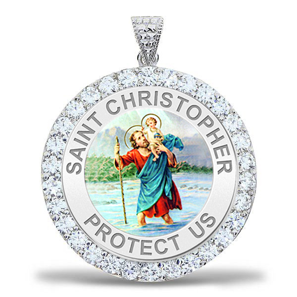 Saint Christopher CZ Round Religious Medal - " COLOR EXCLUSIVE"