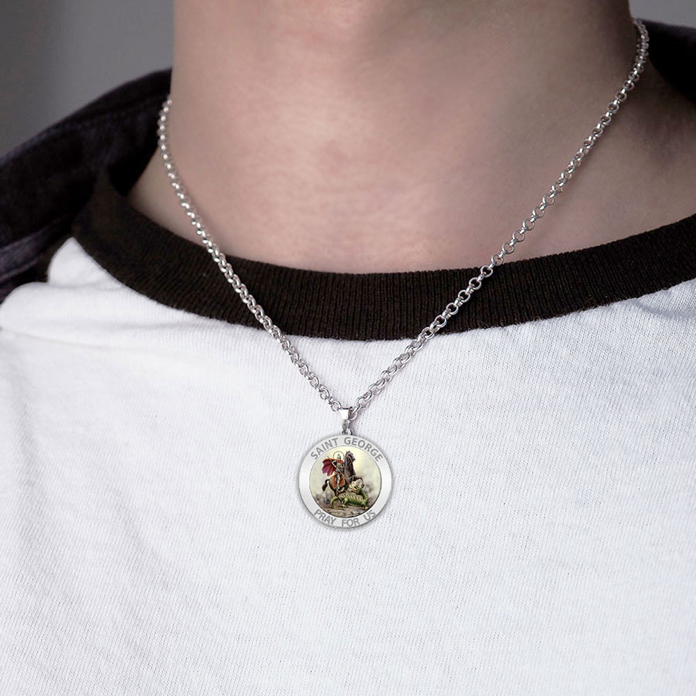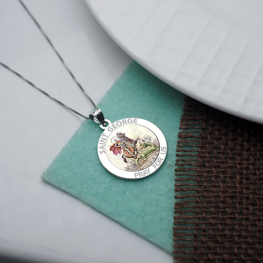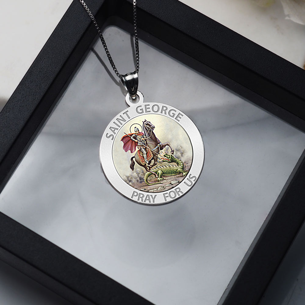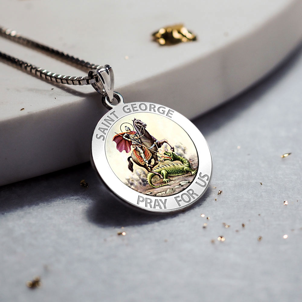 Color Medals can be worn in the pool, shower, etc. In Christian hagiography Saint George (ca. 275-281April 23, 303) was a soldier of the Roman Empire, from the then Greek-speaking Anatolia, now modern day Turkey, and is venerated as a Christian martyr. Saint George is one of the most venerated saints in the Eastern Orthodox Church and Oriental Orthodox Churches. He is immortalized in the tale of George and the Dragon and is one of the Fourteen Holy Helpers. St. George is the patron saint of Aragon, Canada, Catalonia, England, Ethiopia, Georgia, Greece, Montenegro, Palestine, Portugal, Russia, and Serbia, as well as the cities of Amersfoort, Beirut, Ferrara, Freiburg, Genoa, Ljubljana, and Moscow, as well as a wide range of professions, organisations and disease sufferers.