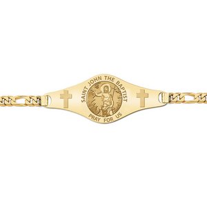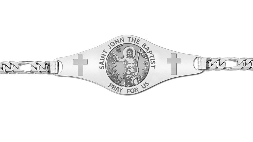 * Comes with a Lobster Claw Clasp. * This bracelet is Unisex and can be for a man or woman. * 7 Inches is standard for women * 8 Inches is standard for men. * Mens Plate Size: 1 3/4 Inches Wide x 1/2 Inch Tall * Womens Plate Size: 1 Inches Wide x 1/3 Inches Tall Saint John the Baptist was a preacher and ascetic who according to Christian tradition, attracted large crowds on the banks of the Jordan River, suggesting repentence and baptism in view of the imminent coming of the Kingdom of God. Jesus was one of those whom he baptized. He was killed by Herod Antipas, whom John had denounced for his (incestuous) marriage. Jesus' own ministry followed John's, and some of Jesus' early followers had previously been followers of John. John, like Jesus, preached at a time of political, social, and religious conflict, and he prophesied that fire was coming to destroy the wicked. Christians commonly refer to John as the Precursor or Forerunner of Jesus, since in the gospels, John announces Jesus' coming. He is also identified with Elijah, and is described as a relative of Jesus Scripture describes John as endowed with prenatal grace, so the feast day of his birth (June 24) is celebrated more solemnly than that marking his martyrdom (August 29). John followed the example of previous Hebrew prophets, living austerely, challenging sinful rulers, calling for repentance, and promising God's justice. He also conferred baptism as a purification rite for repentant sinners ("baptism of John"), which the Bible clearly differentiates from baptism as practiced by Christians after Pentecost.[citation needed]