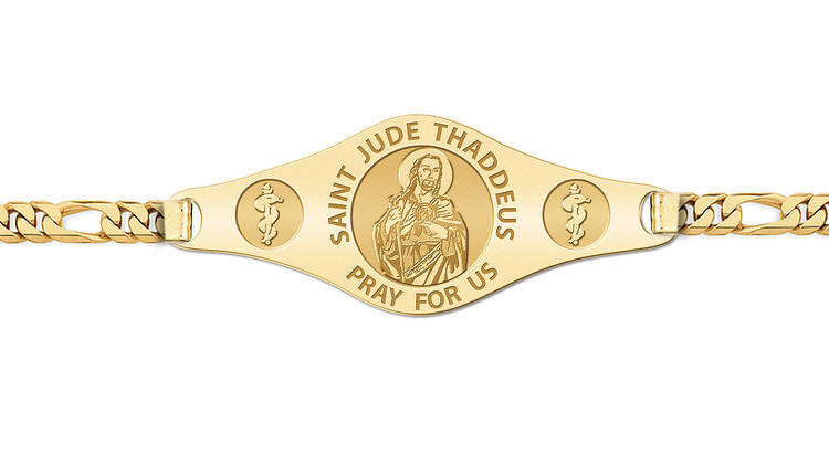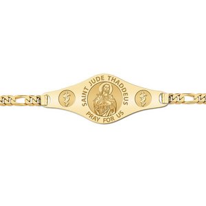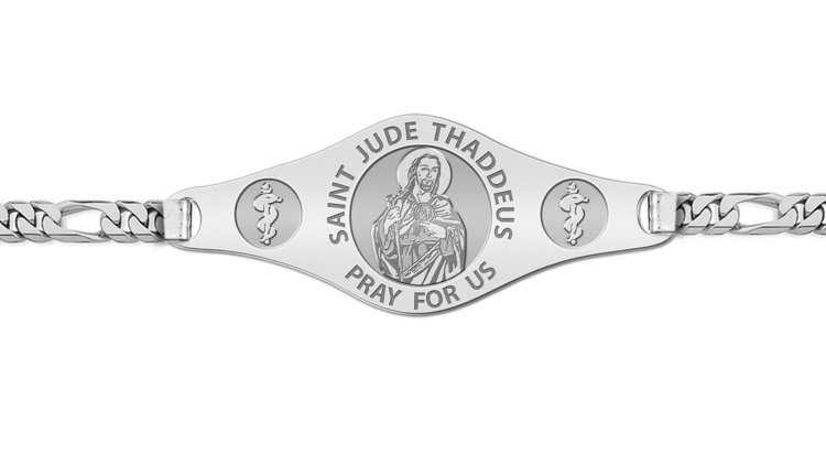 * Comes with a Lobster Claw Clasp. * This bracelet is Unisex and can be for a man or woman. * 7 Inches is standard for women * 8 Inches is standard for men. * Mens Plate Size: 1 3/4 Inches Wide x 1/2 Inch Tall * Womens Plate Size: 1 Inches Wide x 1/3 Inches Tall Saint Jude was one of the Twelve Apostles of Jesus. He is generally identified with Thaddeus, and is also variously called Jude of James, Jude Thaddaeus , Judas Thaddaeus or Lebbaeus. He is sometimes identified with Jude, brother of Jesus, but is clearly distinguished from Judas Iscariot, another disciple and later the betrayer of Jesus. The Armenian Apostolic Church honours Thaddeus along with Saint Bartholomew as its patron saints. In the Roman Catholic Church he is the patron saint of desperate cases and lost causes. Saint Jude's attribute is a club. He is also often shown in icons with a flame around his head. This represents his presence at Pentecost, when he received the Holy Spirit with the other apostles. Occasionally he is represented holding an axe or halberd, as he was brought to death by one of these weapons. In some instances he may be shown with a scroll or a book (the Epistle of Jude) or holding a carpenter's rule.