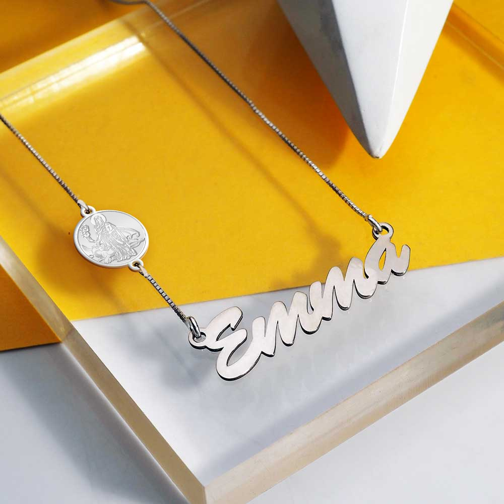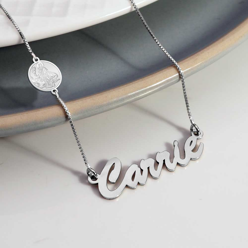 This Nameplate with Saint is an exclusive and unique item with Pictures On Gold. You can engrave the Back of the Saint charm attached to the chain! A Perfect gift to add their Confirmation Saint to their name. !