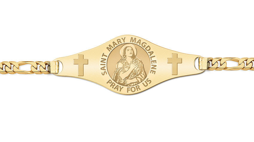 * Comes with a Lobster Claw Clasp. * This bracelet is Unisex and can be for a man or woman. * 7 Inches is standard for women * 8 Inches is standard for men. * Mens Plate Size: 1 3/4 Inches Wide x 1/2 Inch Tall * Womens Plate Size: 1 Inches Wide x 1/3 Inches Tall Saint Mary Magdalene is described, both in the canonical New Testament and in the New Testament apocrypha, as a devoted disciple of Jesus. She is considered by the Roman Catholic, Eastern Orthodox, and Anglican churches to be a saint, with a feast day of July 22. She is also commemorated by the Lutheran Church with a festival on the same day. The Orthodox Church also commemorates her on the Sunday of the Myrrhbearers, which is the second Sunday after Pascha (Easter). Mary Magdalene's name identifies her as "of Magdala" the town she came from, on the western shore of the Sea of Galilee and thus distinguishes her from the other Marys referred to throughout the New Testament. She is the patron saint of hairdressers and apothecaries; Atrani, Italy; Casamicciola Terme, Ischia; contemplative life; converts; glove makers; penitent sinners; people ridiculed for their piety; perfumeries; pharmacists; reformed prostitutes; sexual temptation; tanners; women