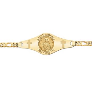 * Comes with a Lobster Claw Clasp. * This bracelet is Unisex and can be for a man or woman. * 7 Inches is standard for women * 8 Inches is standard for men. * Mens Plate Size: 1 3/4 Inches Wide x 1/2 Inch Tall * Womens Plate Size: 1 Inches Wide x 1/3 Inches Tall Monica (or Monnica) (331 387) is a Christian saint and the mother of Augustine of Hippo, who wrote extensively of her virtues and his life with her in his Confessions. Monica was of Berber descent. She was born in Roman Africa. Her parents brought her up as Christian and married her to an older pagan man named Patricius, a curialis of Thagaste (located in modern-day Souk Ahras, Algeria). He was a man of kindness, but also a man given to violent tempers and adultery. Augustine reports that despite the prevalence of domestic violence at the time, because of her obedience to him, Monica was never beaten by Patricius. Initially, she got on poorly with her mother-in-law, but Monica won her over by her respectfulness, patience, and gentleness. Monica attended Holy Mass daily and cultivated the virtue of patience. She advised other wives, who were beaten, to hold their tongues around their husbands, rather than proudly withstand them. Eventually, she converted Patricius to Christianity and calmed his violent nature. Monica bore three children, among them Augustine. Augustine made her very happy with his successes as a scholar and teacher, but he also made her very ashamed with his debauchery. For ten years, Augustine lived with his mistress and subscribed to Manichaeism. Monica sent Augustine to a bishop to be convinced of his errors. The bishop, however, was unable to prevail, and he advised St. Monica simply to continue to pray for her son. He told her, "it cannot be that the son of these tears should perish." When her spouse Patricius died, Monica joined Augustine in Italy. There, some time later, she had the pleasure of seeing her son, at the age of 33, converted and baptized by Ambrose. Not long after, as she was preparing to return to Africa, she died at the age of 56 at the port of Ostia. As recounted by Augustine, before she died she told him: "There was indeed one thing for which I wished to tarry a little in this life, and that was that I might see you an orthodox Christian before I died. My God hath answered this more than abundantly, so that I see you now made his servant and spurning all earthly happiness. What more am I to do here?"