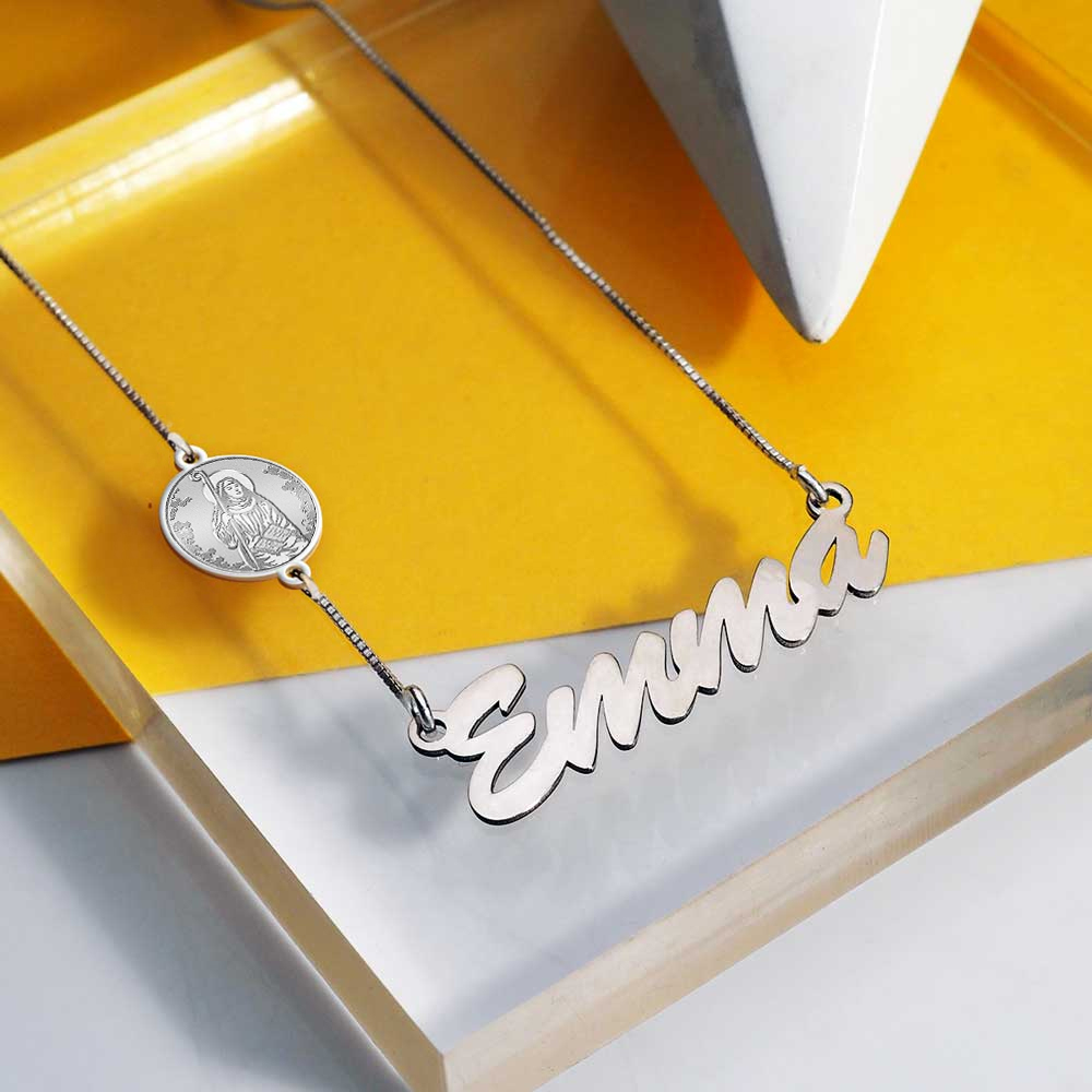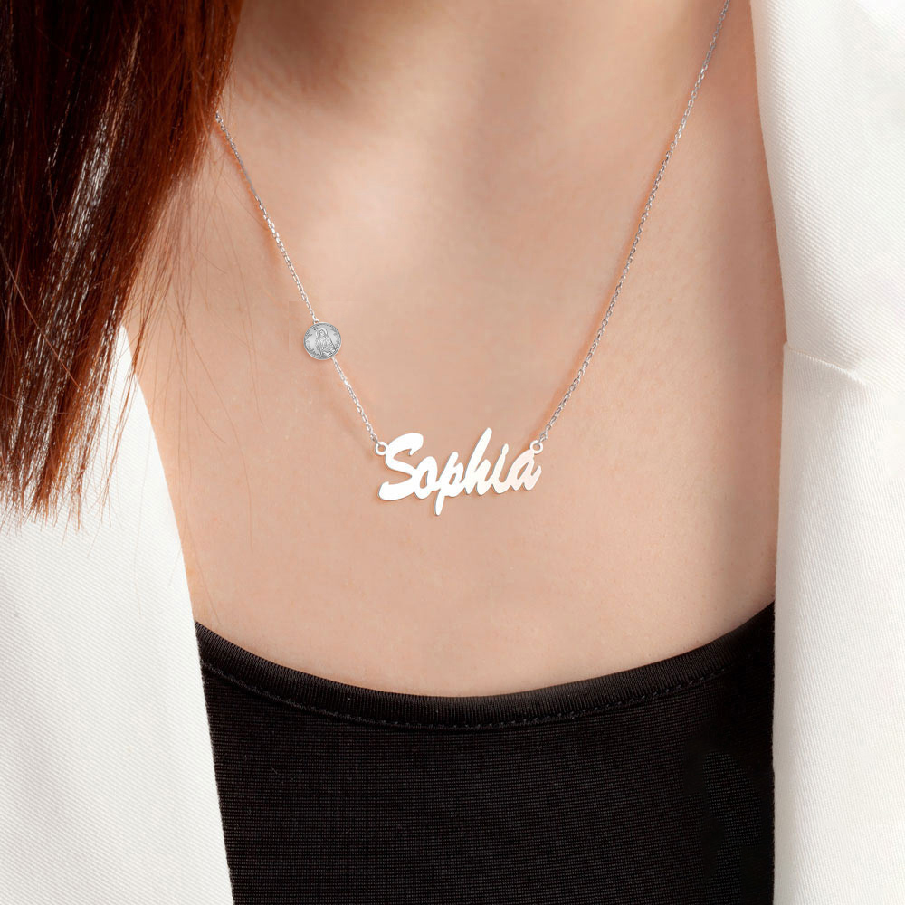 This Nameplate with Saint is an exclusive and unique item with Pictures On Gold. You can engrave the Back of the Saint charm attached to the chain! A Perfect gift to add their Confirmation Saint to their name. !