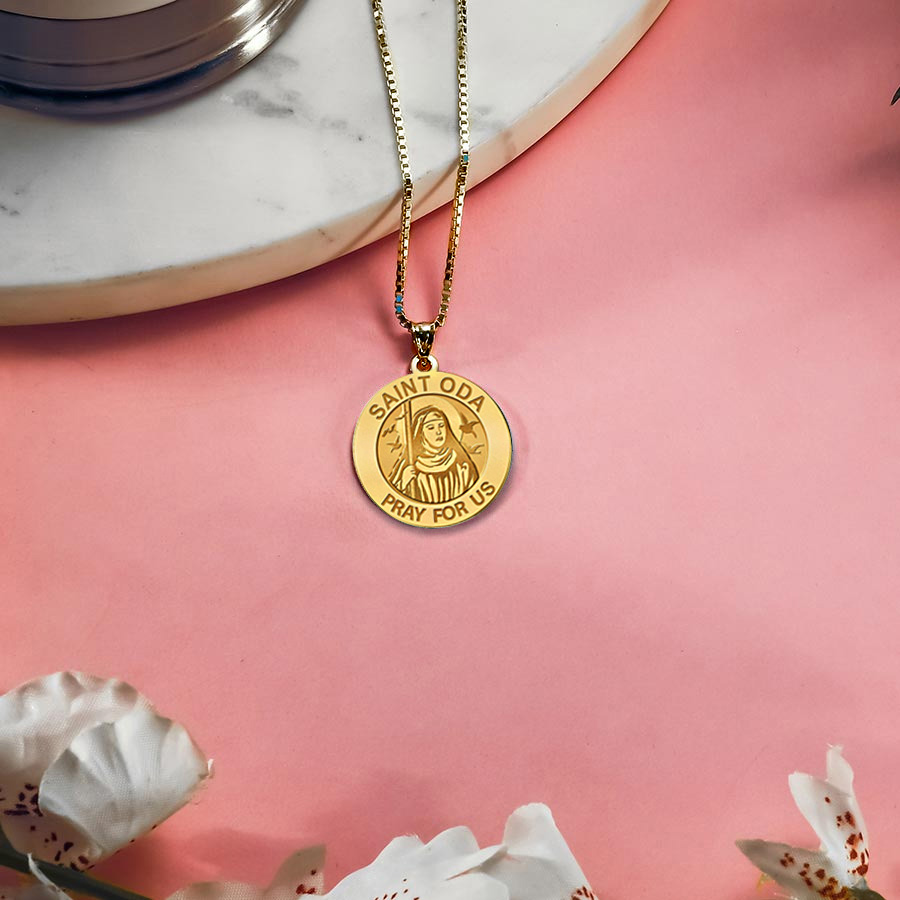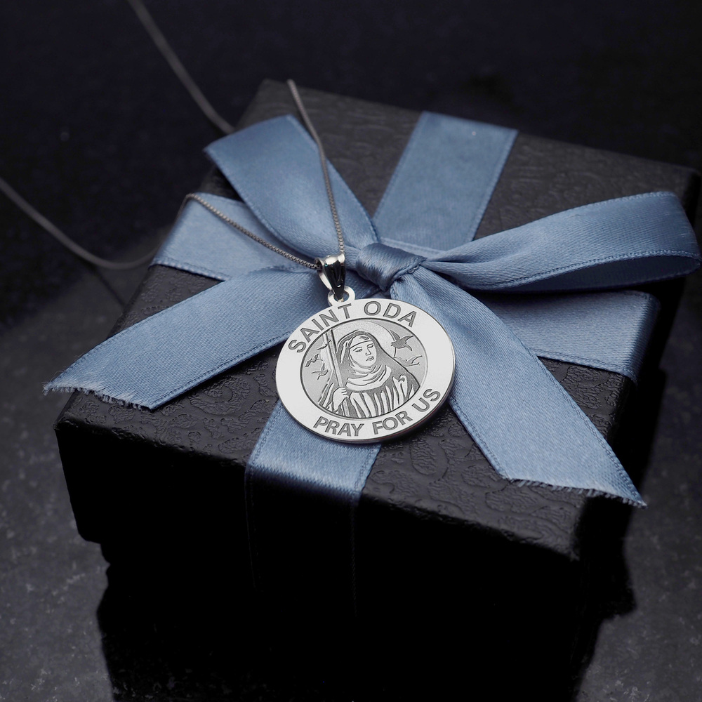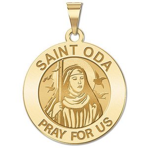 Oda was born blind and her father sent her on pilgrimage to Lige to visit the relics of Saint Lambert. While praying at Saint Lambert's grave she was miraculously cured from her blindness. The miraculous cure of Oda is recorded in Saint Lambert's 8th century vitae. Vowing to dedicate her life to God, she returned to Scotland. According to records written in the 13th century, her father wanted her to marry in Scotland. Because of her vow she fled across the North Sea. After a pilgrimage to Rome and Monte Sant'Angelo sul Gargano, she moved to live in an open space in the woods in a place now known as Sint Oedenrode in the Netherlands (a small manmade open space in the woods is called a 'rode' in Dutch - the village is named after Oda). 16th century records describe how Oda prayed in various villages in the Netherlands and Belgium only to be disturbed by magpies. She fled from the magpies and the birds led her to the open space in the forest. Some accounts describe her as a king's daughter, but as there was no Kingdom of Scotland at that time her background is problematic.