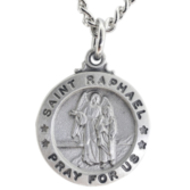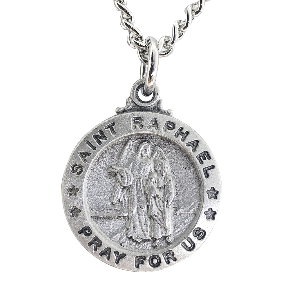 This Saint Raphael medal measures at 3/4 inch x 3/4 inch, the height of a nickel.