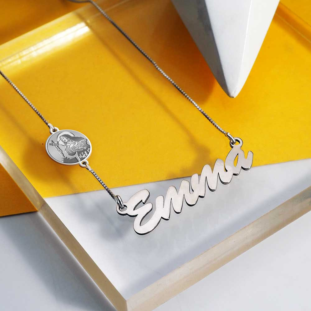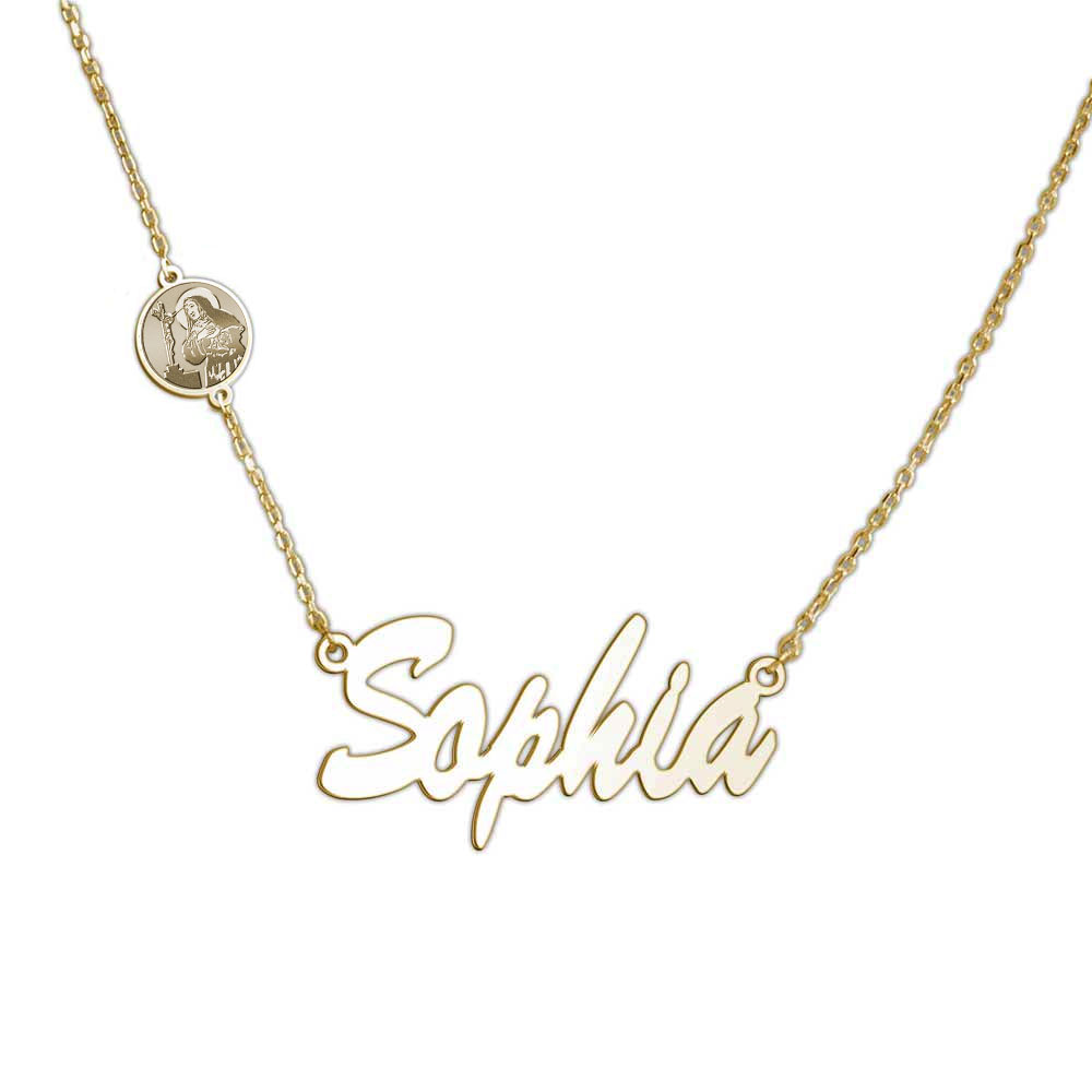 This Nameplate with Saint is an exclusive and unique item with Pictures On Gold. You can engrave the Back of the Saint charm attached to the chain! A Perfect gift to add their Confirmation Saint to their name. !