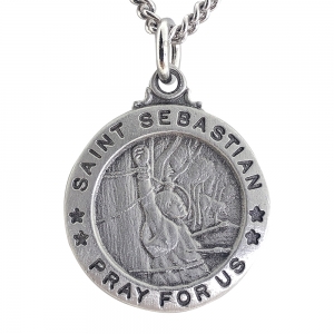 Saint Sebastian was a Christian saint and martyr, who is said to have been killed while the Roman emperor Diocletian engaged in the persecution of Christians in the 3rd century. He is commonly depicted in art and literature tied to a post and shot with arrows just like on this medal. He is patron saint to Soldiers, plagues, arrows, athletes and unofficially youth.