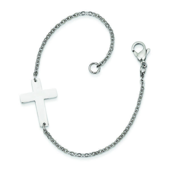 This Stainless Steel Polished Sideways Cross 7.25in Bracelet's Average Weight is 2.75 GM The Cross on the Bracelet Measures at Over 3/4 Inch Wide x 2/3 Tall **All sizes listed are approximate measurements**