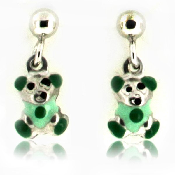 Sterling Silver Enamel " Green Teddy Bear " Dangle Post Earrings