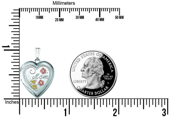 This .925 Solid Sterling Silver Locket has Mom engraved on the center of the front side. It holds 2 photos and can be engraved on the reverse and inside.