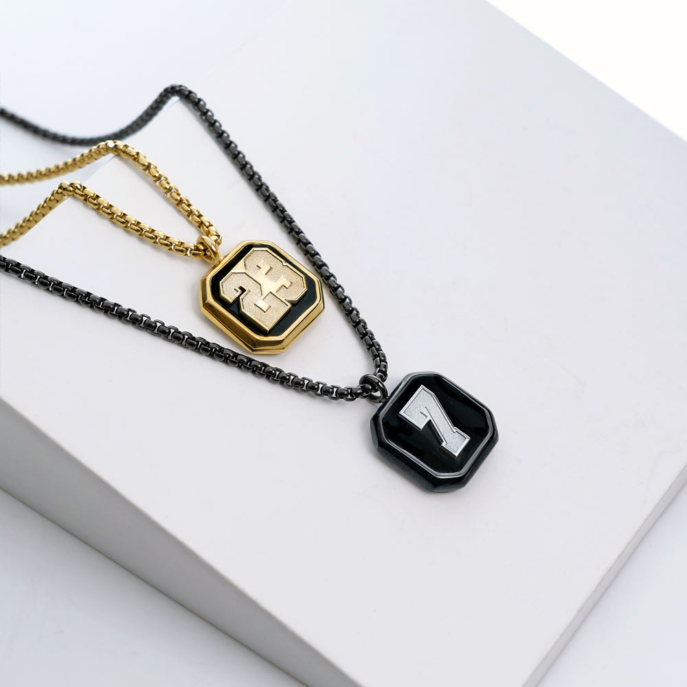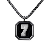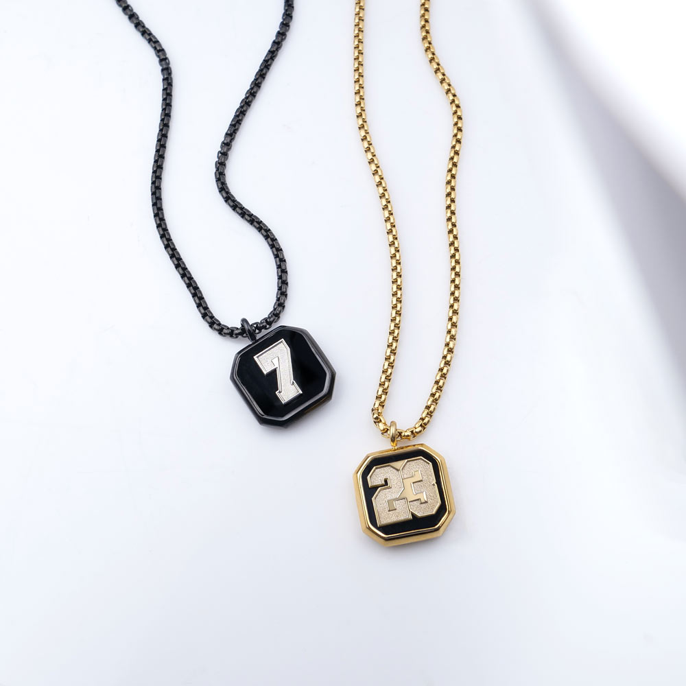 Introducing our Square Black Onyx Personalized Number Necklace, a sleek accessory for those who value style and personalization. Crafted with precision, the pendant features a black onyx-type background with your chosen number in sterling silver. Versatile for men, women, or children, wearers can display their own or a loved one's number, perfect for any sport or daily wear. Crafted from stainless steel, it's rust-resistant and won't tarnish, ensuring lasting shine. Complete with a 24-inch chain, this necklace ships in just one day, making it an ideal last-minute gift or personal indulgence. Elevate your style with our Square Black Onyx Personalized Number Necklace a statement piece for any occasion.